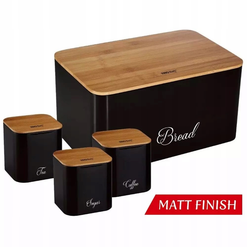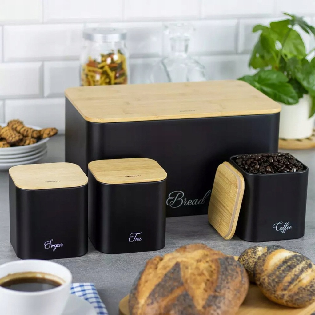 Chlebak ze stali węglowej pokrytej emalią w kolorze czarnym + zestaw 3 pojemników na kawę, herbatę i cukier. Wykończenie matowe.