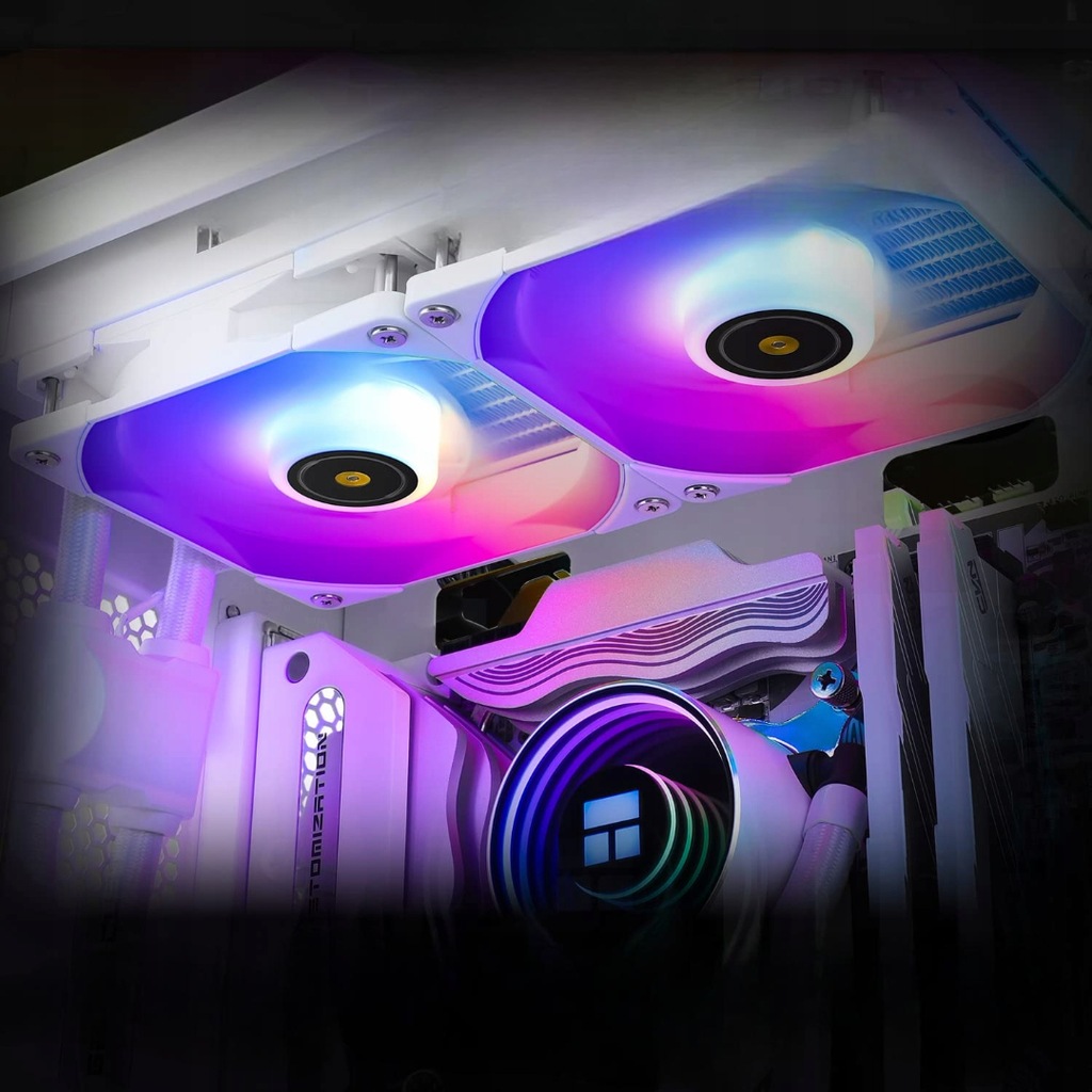 Symetryczny wentylator TL-E12B-S x 2, prędkość może osiągnąć 2000 obr./min ± 10%, rozmiar to 120 x 120 x 25 mm, hałas ≤ 27,7 DBA, interfejs: 4-pinowy PWM, ciśnienie wiatru: 2,87 mm H2O (maks.), powietrze objętość: 72.72.37 CFM (maks.), łożysko S-FDB V2 może rozwiązać problem chatteringu wentylatora w trybie podnoszącym, z funkcjami PWM i ARGB, prędkość może automatycznie dostosować prędkość do temperatury procesora. Kolor światła ARGB można ustawić ręcznie.