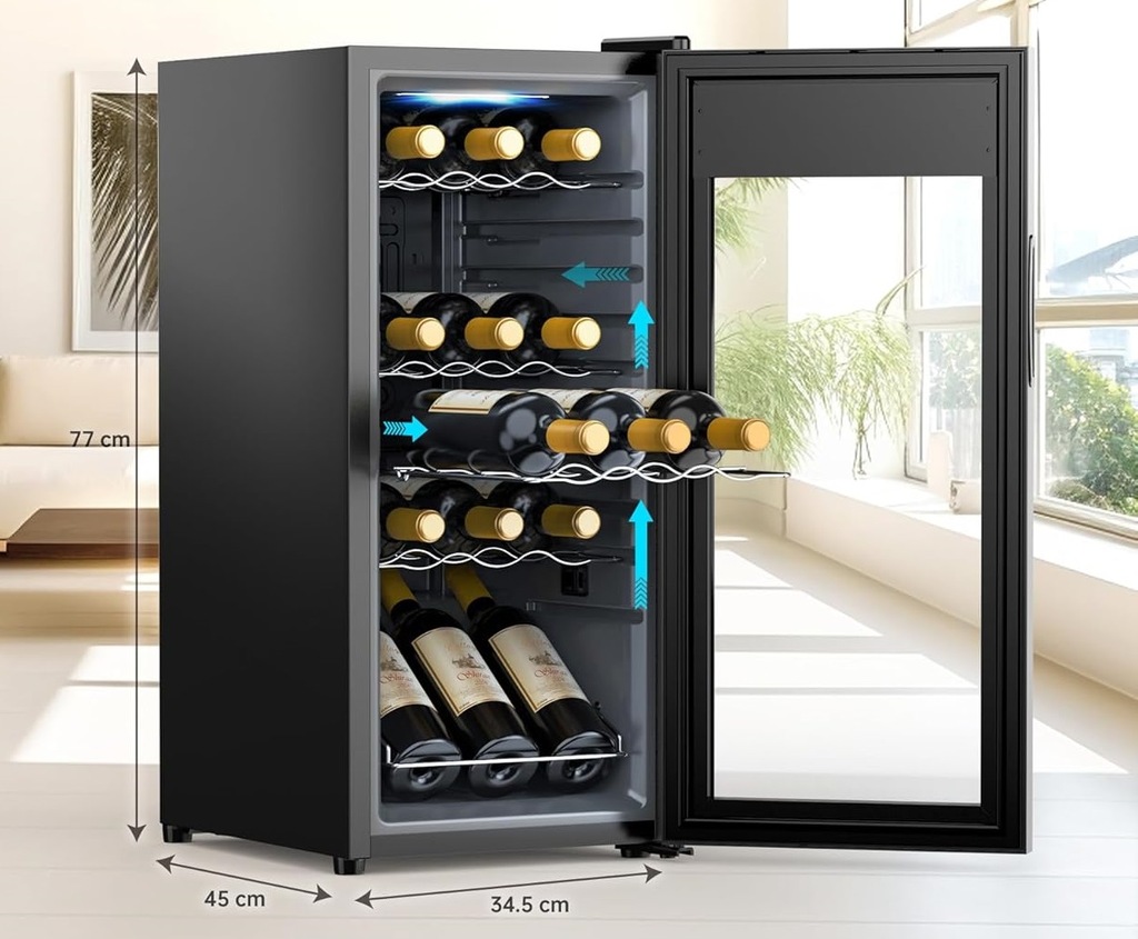 Chłodziarka do wina oferuje miejsce na 18 butelek wina (53 litry) na 6 regulowanych półkach. Z łatwością stworzysz w domu środowisko do leżakowania wina, odpowiednie do długotrwałego przechowywania. Idealna do salonu, biura, kuchni, baru lub pokoju rozrywki.