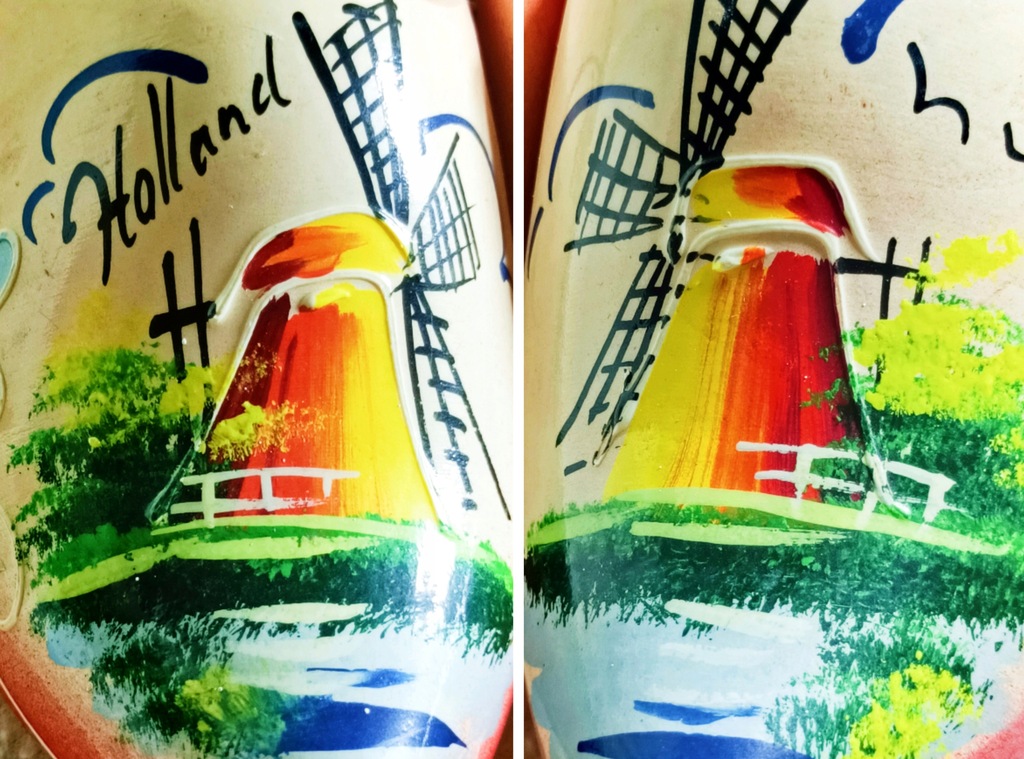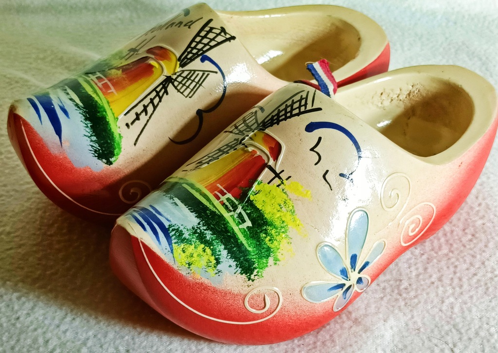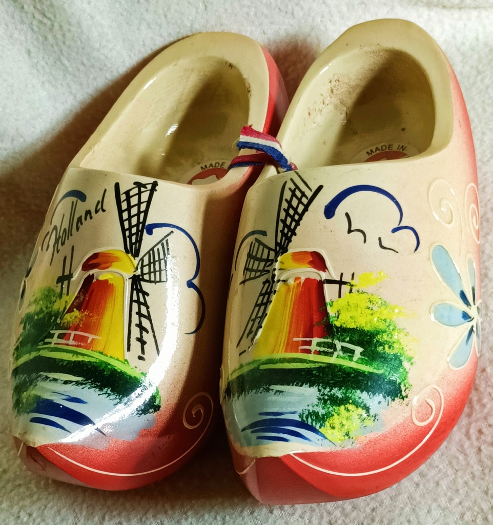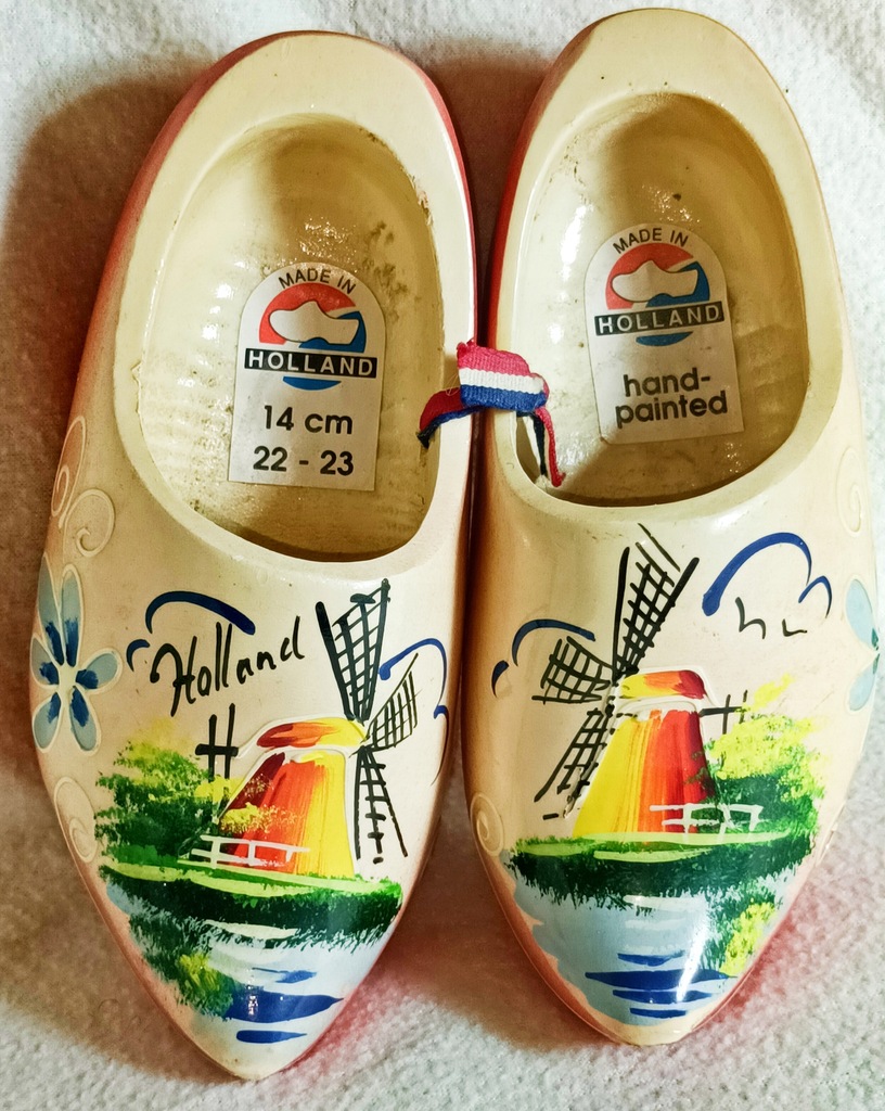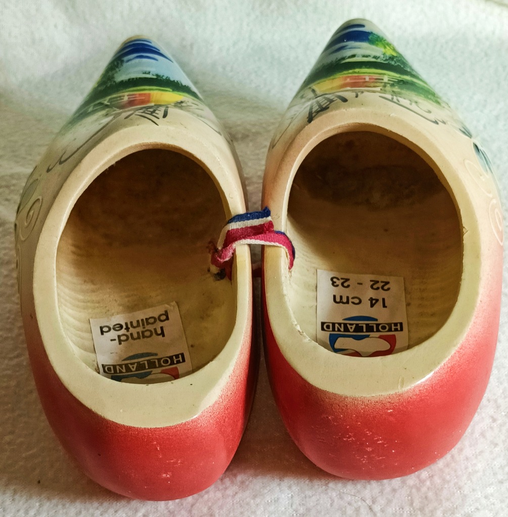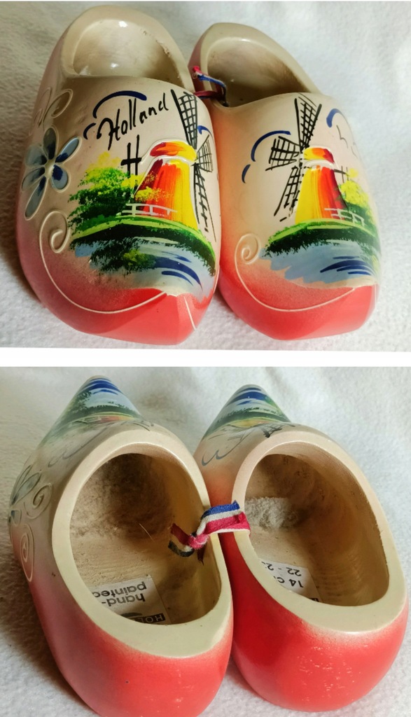 Oferuje (jedna Para) tradycyjnych, drewnianych, rustykalnych, używanych sabotów/chodaków/trepów/"klompów". Rozmiar: 22-23 (długość podeszwy ok 17cm/długość wewnętrzna ok 14cm), szerokość wewn/zewn śródstopia ok 5,5cm/ 7,0cm. Każdy z chodaków został wycięty z jednego kawałka litego drewna. Saboty zostały pokryte powloką malarską oraz barwnym deseniem architektonicznym i florystycznym. Stan przedmiotów oceniam jako (PRZYZWOITY - widoczne minimalne ślady składowania). Wygląd dokładnie jak na zdjęciach zamieszczonych w aukcji.