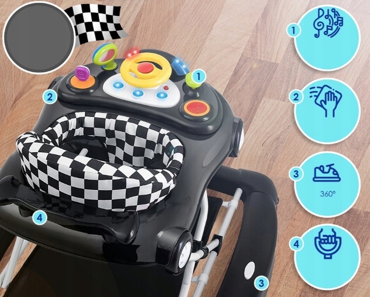 - 🛋️ Funkcja bujania: Wystarczy jedno kliknięcie, by zamienić chodzik w przytulny fotelik bujany – idealny do odpoczynku.