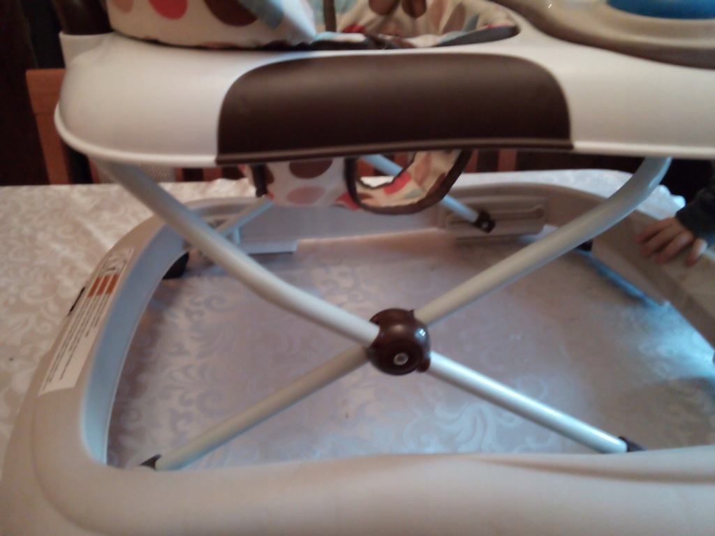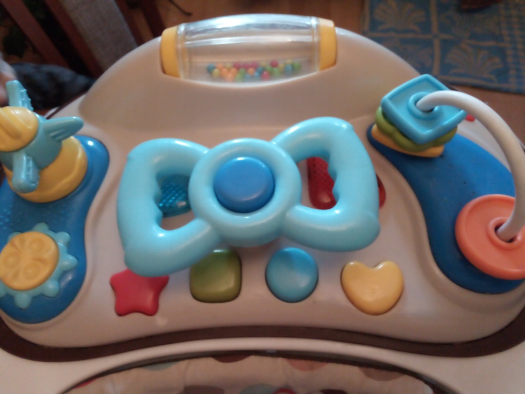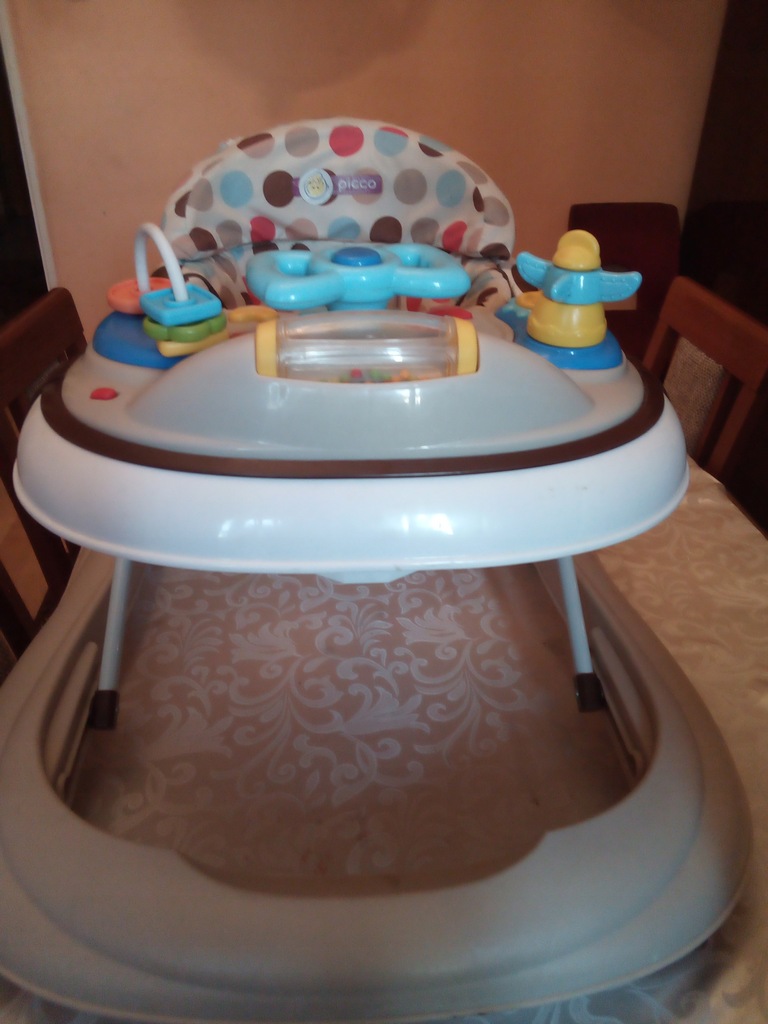 witam! chodzik używany przez jedno dziecko.w pełni sprawny.dźwięki działają.dwupoziomowa regulacja wysokości.stan oceniam jako dobry,ponieważ jest przetarcie na materiale lecz można zszyć i w niczym to nie przeszkadza(zdjęcie piąte)