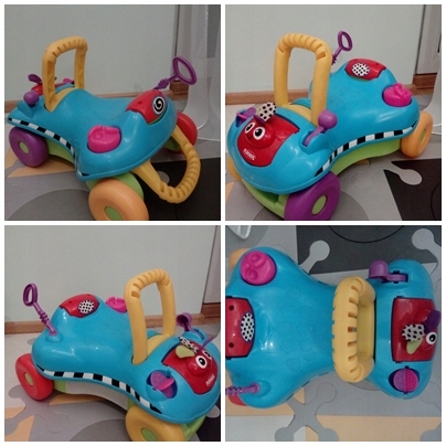 Chodzik-jeździk dla maluszków. Zabawka rozwijająca sprawność fizyczno-ruchową. Dziecko może usiąść na nim i odpychać się nóżkami (działa jak jeździk) lub też, po podniesieniu pokrywy, wykorzystać jej uchwyt i uczyć się chodzić (działa jak chodzik).