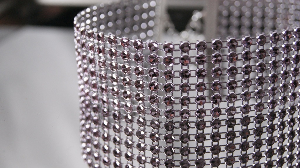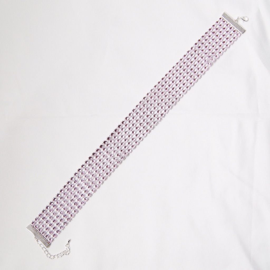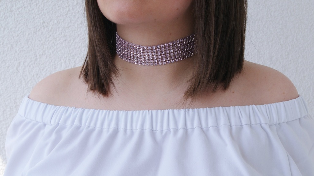 Szeroka obroża/choker w kolorze srebrnym z różowymi cyrkoniami. Można ją nosić samodzielnie lub z dodatkową biżuterią.