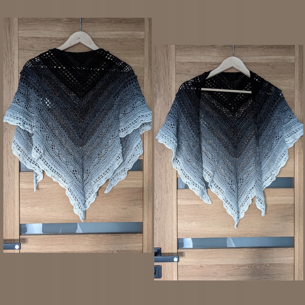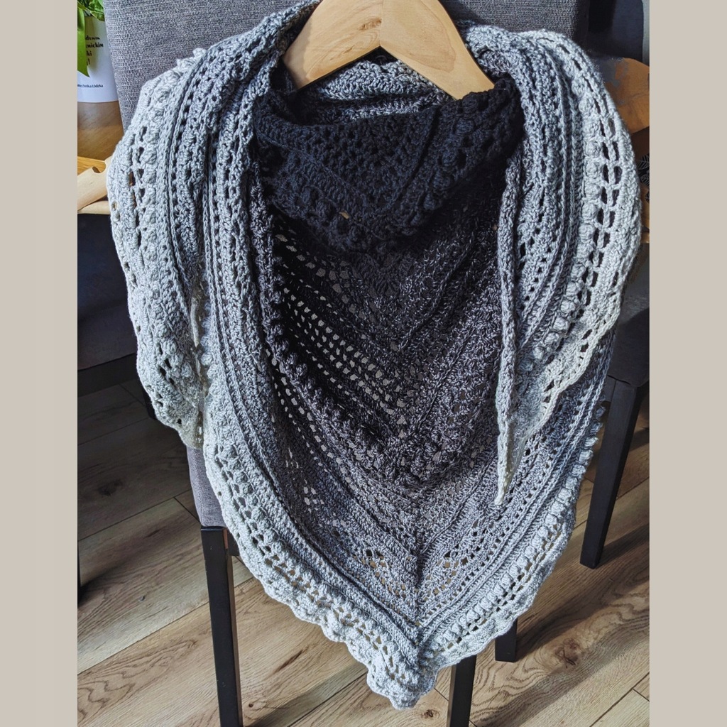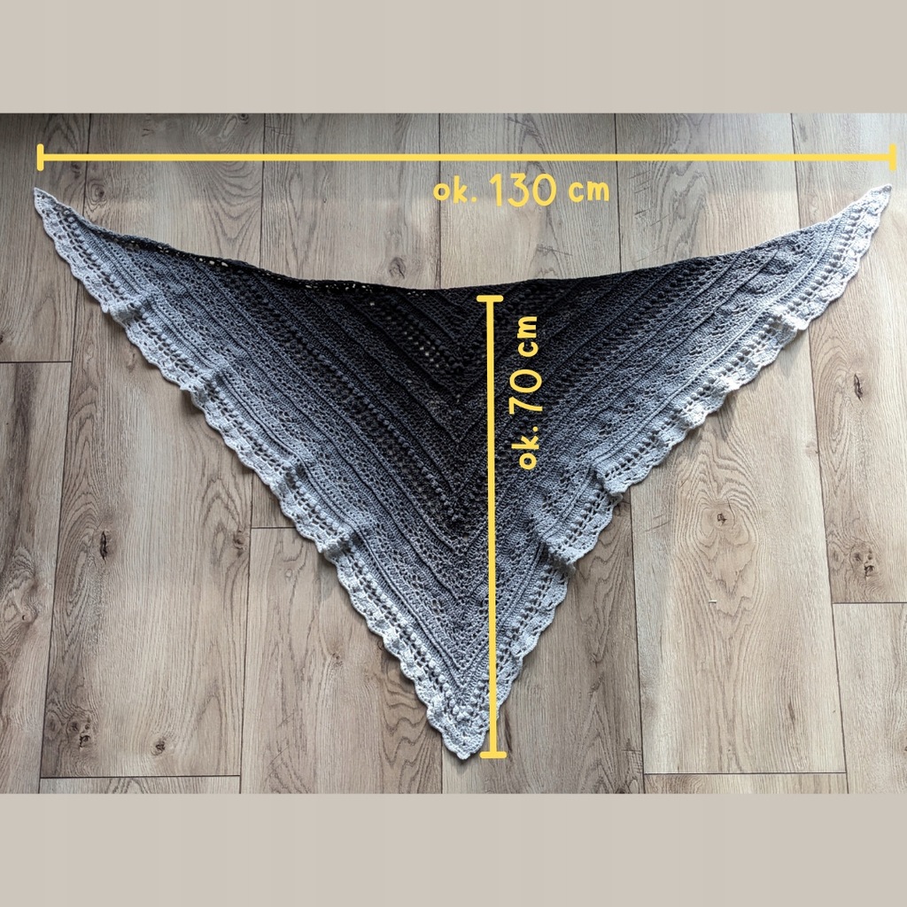 - Wymiary chusty: 130 cm najdłuższy bok, 70 cm wysokość