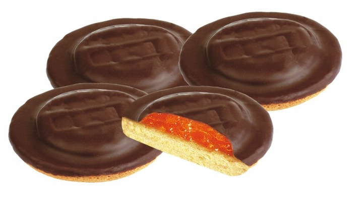 Biszkopty z galaretką o smaku MALINOWE w polewie kakaowej.