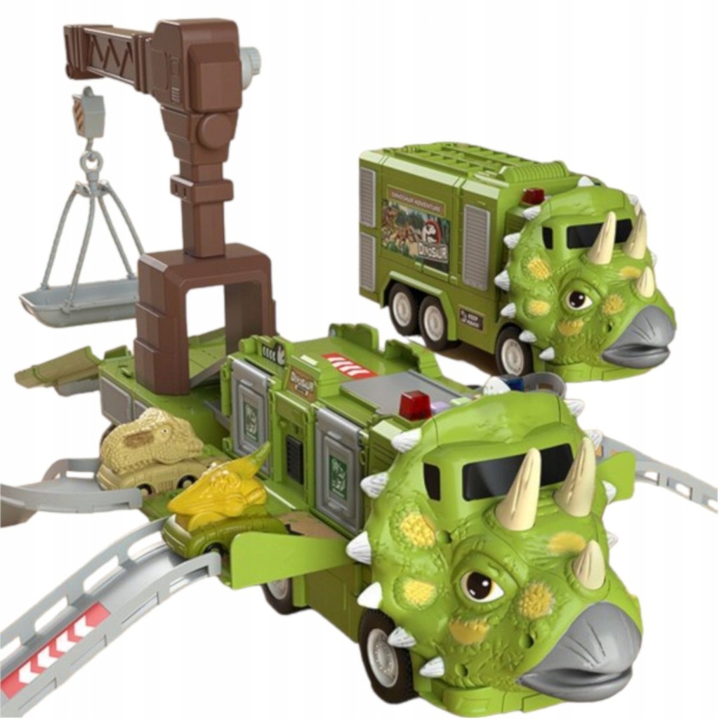 Ciężarówka dinozaur triceratops tir laweta otwierana dźwig plus trzy auta dinozaury