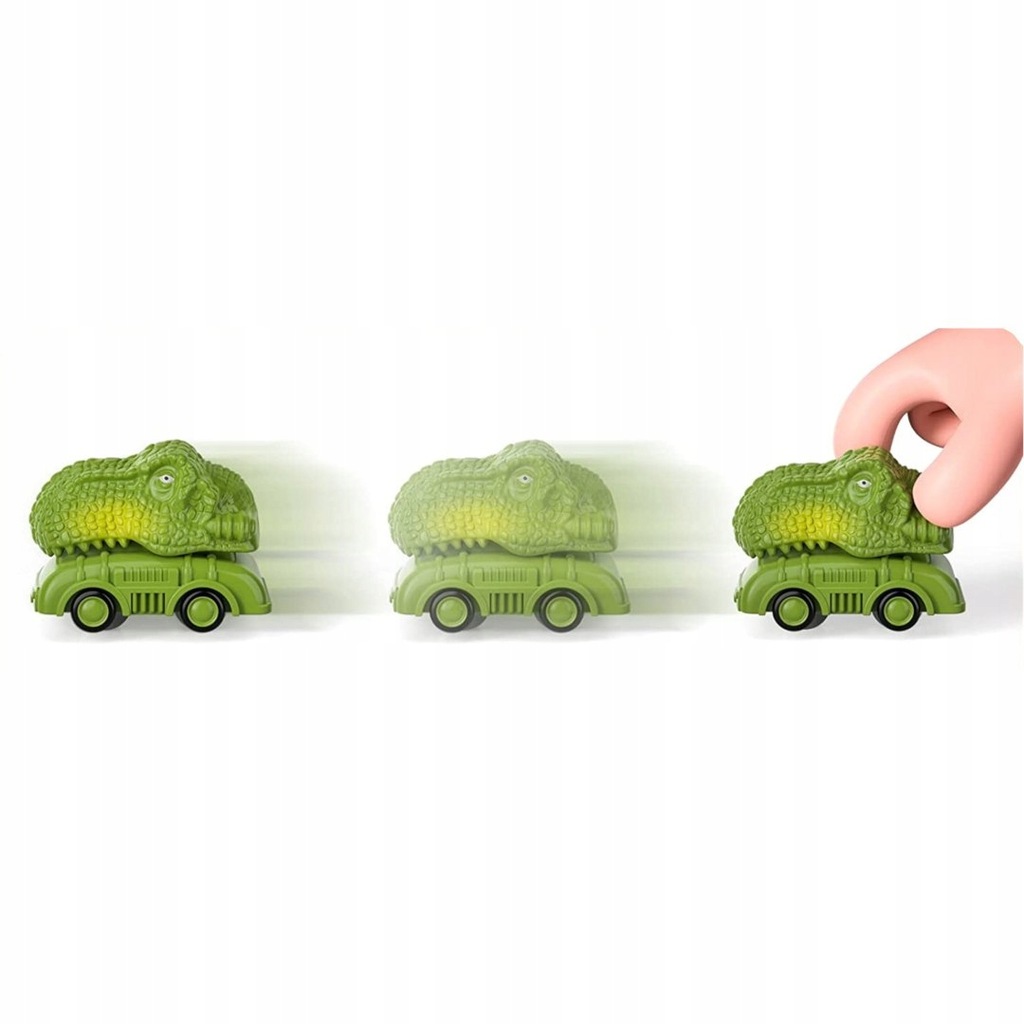 • trzy małe samochodziki w kształcie głów dinozaurów: t-rex, triceratops, pterozaur