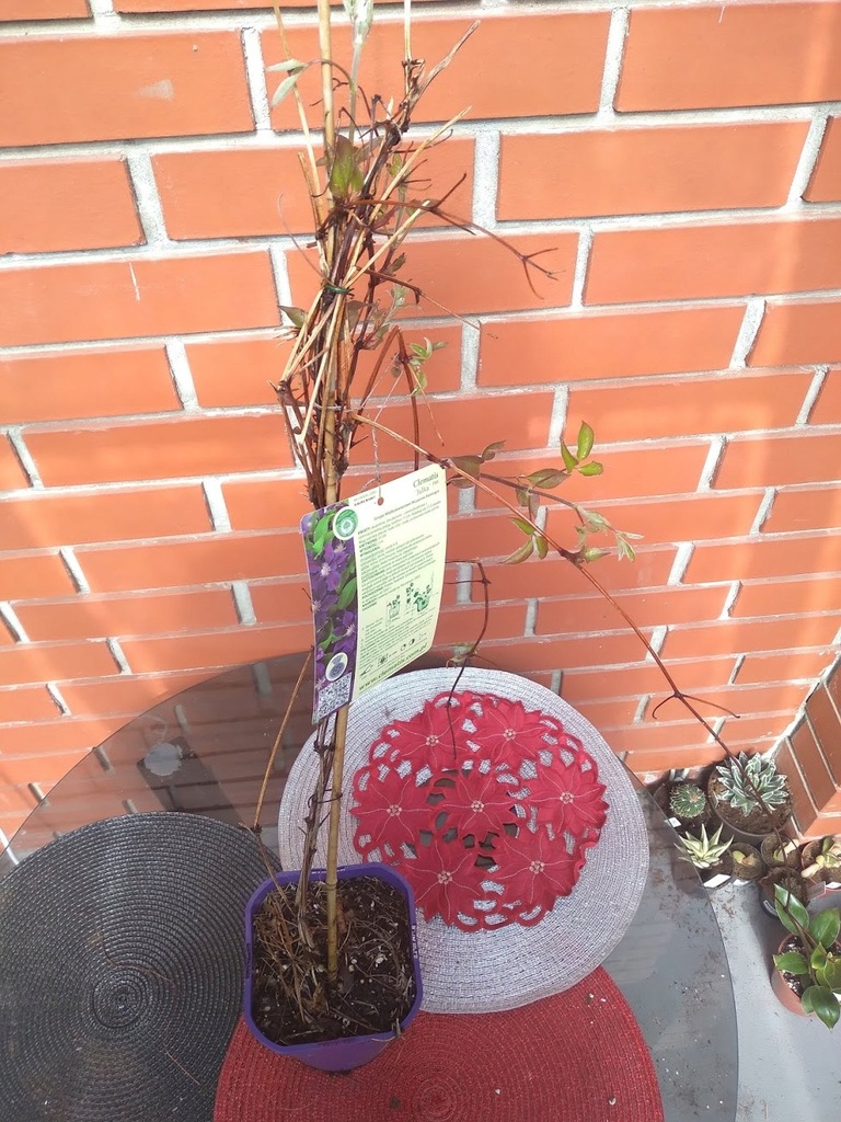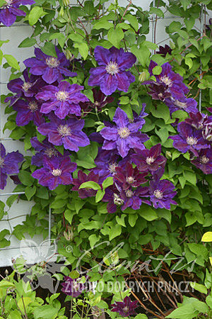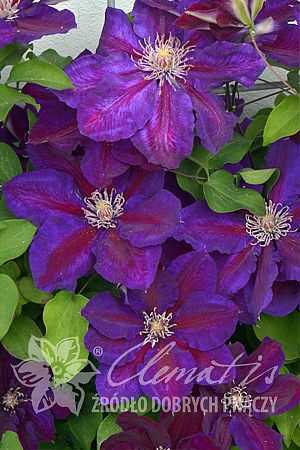 JAK WYGLĄDA: Kwiaty duże, śr. 15 cm, aksamitne, dwubarwne ˗ ciemnofioletowe z ciemnoczerwonym pasem pośrodku działek. Pręciki mają purpurowo-białe pylniki na białych nitkach. Kwitnie VI˗VII i mniej intensywnie w VIII. Liście trójdzielne, złożone z trzech eliptycznych, ostro zakończonych listków, ciemnozielone, półmatowe.