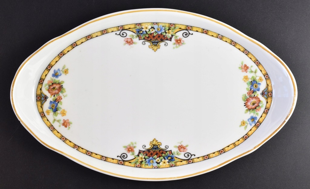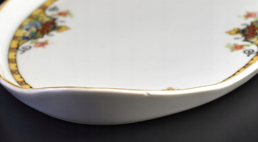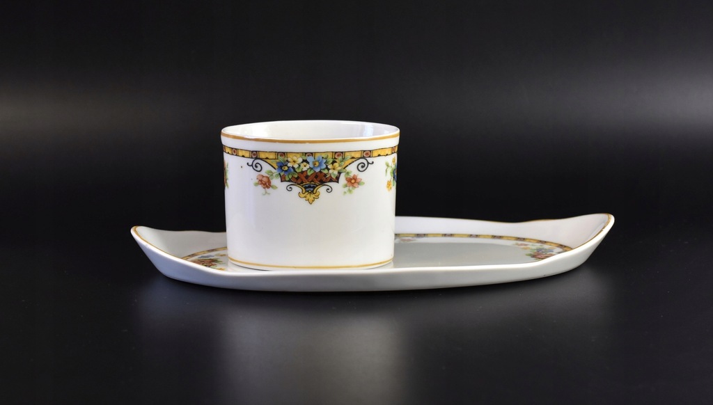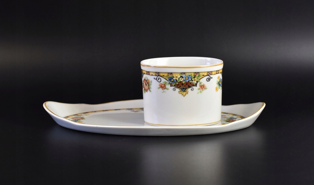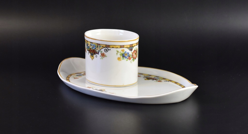 Biała porcelana zdobiona kolorowymi motywami kwiatowymi. Zestaw składa się z tacki oraz pojemnika na papierosy (brak popielniczki). Może oczywiście pełnić również inne funkcje, np. jako akcesorium biurkowe lub kuchenne.