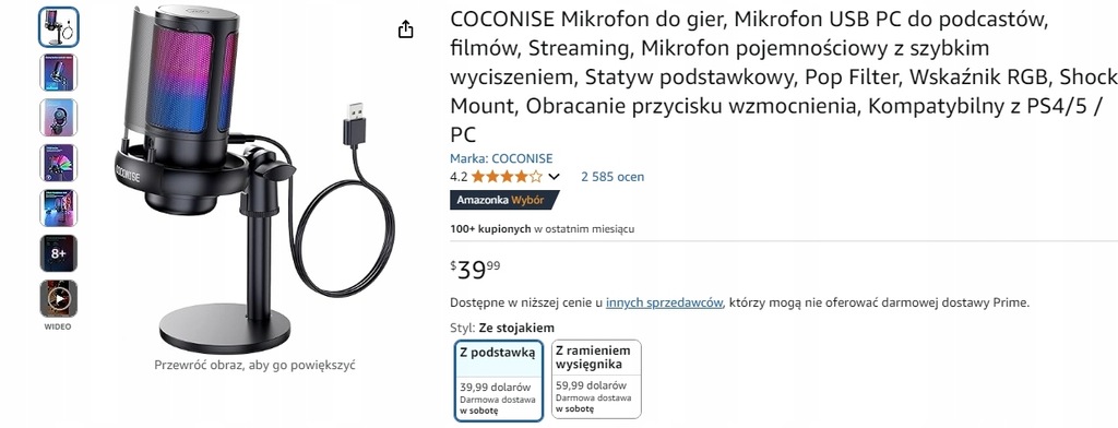 COCONISE Mikrofon do gier, Mikrofon USB PC do podcastów, filmów, Streaming, Mikrofon pojemnościowy z szybkim wyciszeniem, Statyw podstawkowy, Pop Filter, Wskaźnik RGB, Shock Mount, Obracanie przycisku wzmocnienia, Kompatybilny z PS4/5 / PC.