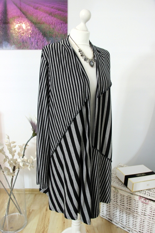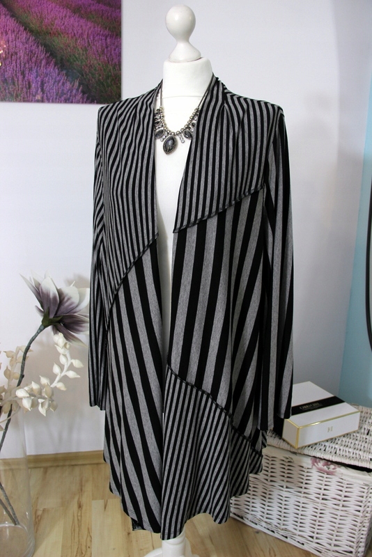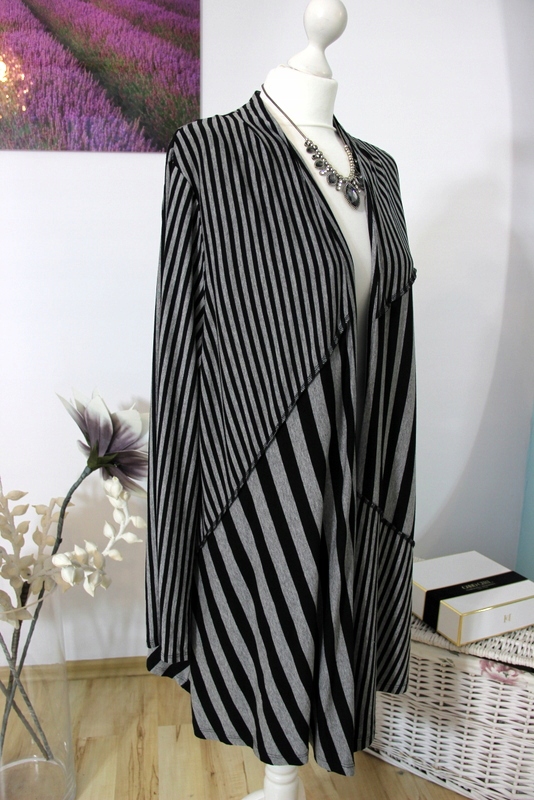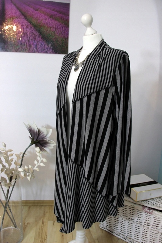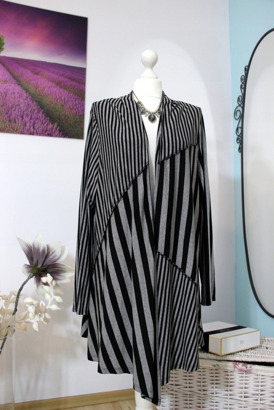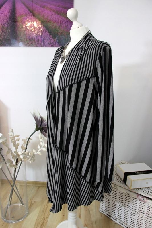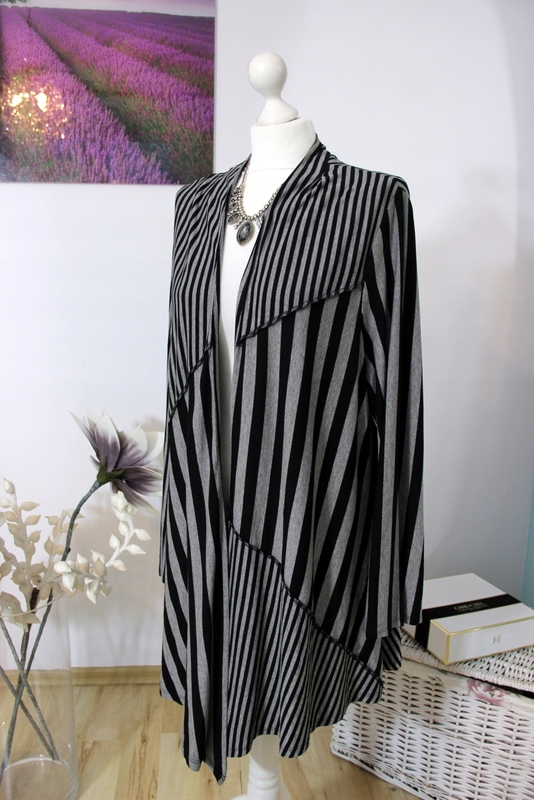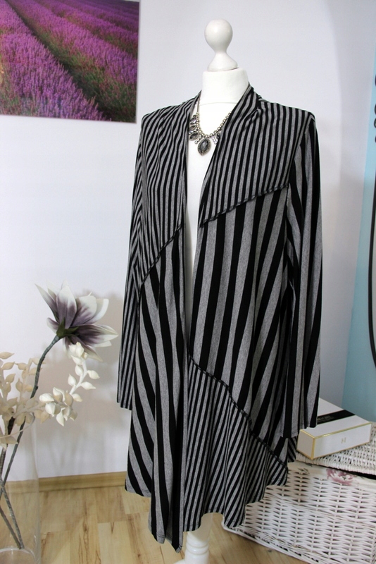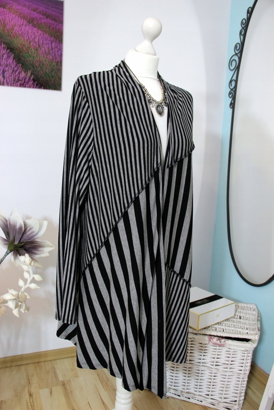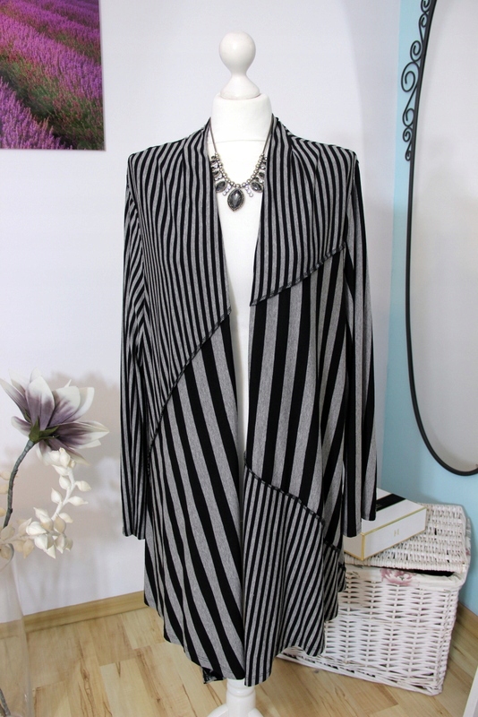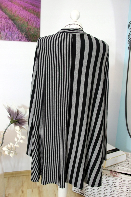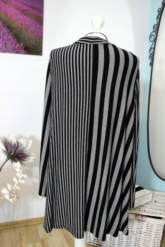 w biodrach70 +cm, długość na plecach 80 cm, z przodu boki wydłużone do 95 cm, długość rękawa od szyi 75 cm, szerokość w bicepsie 19 cm x 2, szerokość w ramionach 46 cm
