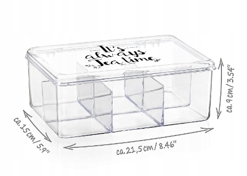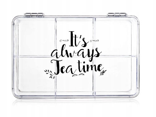 - PONADCZASOWY WYGLAD: pudełko na herbatę z napisem „It's always Tea time” ma sześć oddzielnych przegródek, dzięki czemu jest wystarczająco dużo miejsca na kilka rodzajów herbaty. Idealny dla dla miłośników herbat!