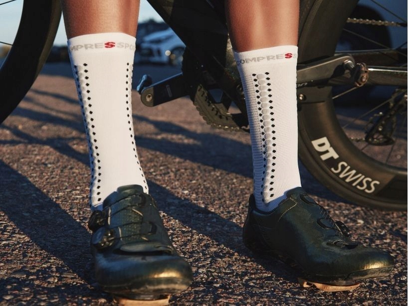 COMPRESSPORT RACING SOCKS v 4.0 BIKE | WHITE/ALLOY - profesjonalne skarpetki kolarskie Nowa czwarta generacja skarpetek rowerowych Compressport Racing Socks. Wykonane z nowego bardziej miękkiego materiału, który jest jeszcze bardziej przyjemny dla skóry. Zapewniają znakomitą przewiewność i pozwalają skórze oddychać oraz świetnie odprowadzają wilgoć na zewnątrz. Skarpetki zapewnią komfort termiczny nawet w upalne letnie dni podczas długich przejażdżek. Skarpetki, w których pojedziesz dalej i dłużej. Skarpetki rowerowe Compressport czwartej generacji zostały wykonane z jeszcze bardziej miękkiego i przyjemnego dla skóry materiału, dzięki czemu zapewniają jeszcze większy komfort i wygodę podczas jazdy. Wokół stopy i z tyłu skarpety zastosowano pasiasty splot, który szybko i sprawnie odprowadza nadmiar potu i wilgoci utrzymując stopy suche i chłodne, nie pozwalając na przegrzanie. Nowy przeprojektowany szerszy nosek gwarantuje lepszą propriocepcję podczas naciskania pedału. Charakterystyczne wsparcie łuku stopy zapewnia wygodne trzymanie, poprawia przepływ krwi i zapobiega skręcaniu lub fałdowaniu się materiału. Wysoka wydajność i osiągi dzięki skarpetom kolarskim Compressport W skarpetach zastosowano technologię 3D.Dots, która zapewnia wsparcie ścięgna Achillesa. Ponad to rząd nowych Flat.Dots gwarantuje lepszą wentylację, a wzór 3D.Dots i Flat.Dots pod stopami zapewnia dodatkową przyczepność w bucie, a także lekką mikrostymulację, aktywując powrót żylny i opóźniając zmęczenie. Boki skarpetki są wyposażone w zupełnie nową technologię Aero.dots, od kostki po szew, kierując przepływ powietrza w celu zmniejszenia turbulencji z tyłu skarpety i zmniejszenia oporu powietrza wraz ze wzrostem prędkości. Krój skarpety jest wyższy niż w naszych modelach terenowych i do biegania, został zaprojektowany specjalnie z myślą o wydajności i estetyce jazdy na rowerze. Materiał: Skład: 96% poliamid, 4% elastan Najważniejsze cechy skarpet rowerowych Compressport: