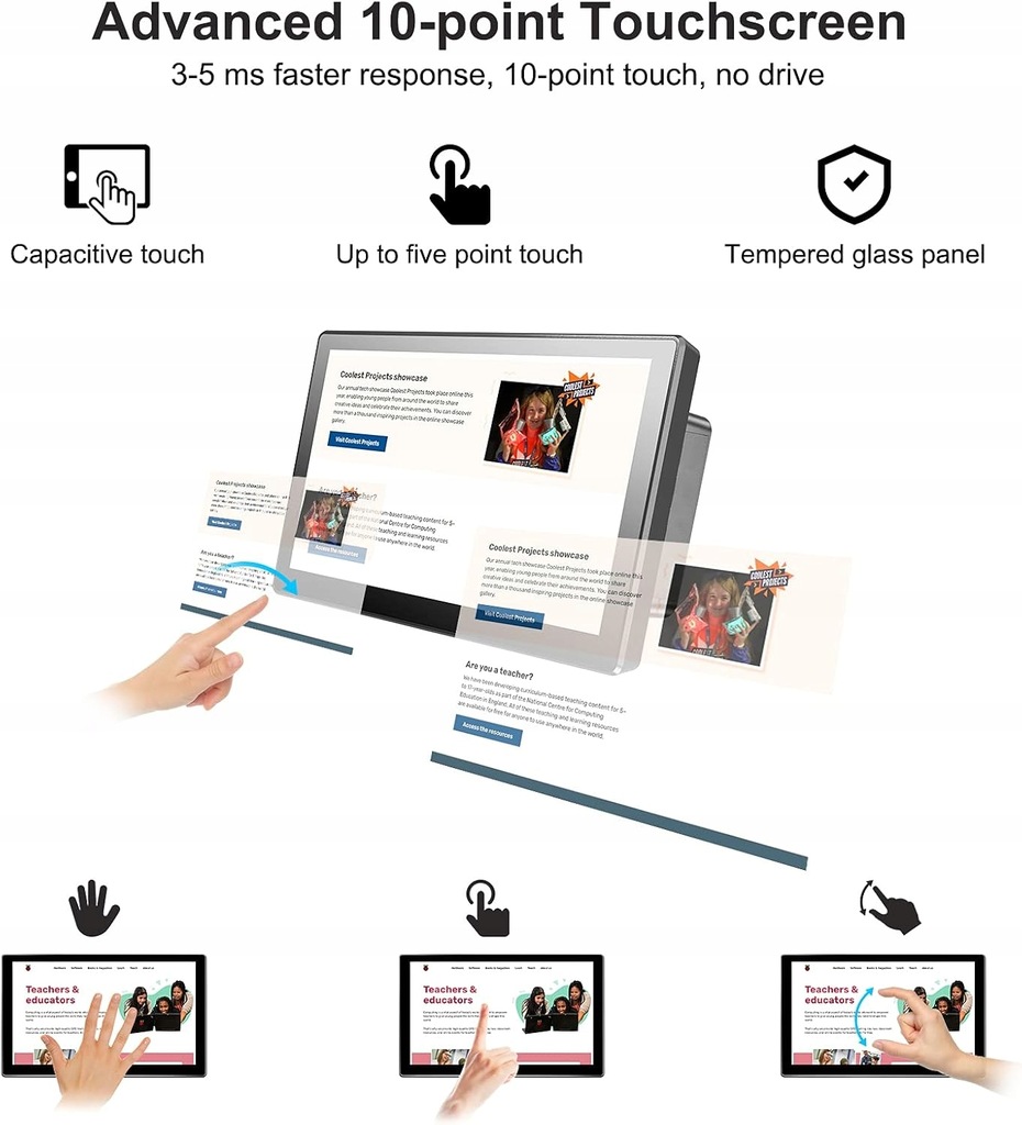 - Pojemnościowy 10-punktowy ekran dotykowy: dzięki czułej technologii pojemnościowej i funkcji multidotyku możesz przesuwać, przewijać, wybierać i powiększać ekran w zaledwie 2 do 5 ms. Możesz łatwo zamontować Raspberry Pi za tym monitorem i z łatwością realizować projekty Raspberry Pi oparte na dotyku.