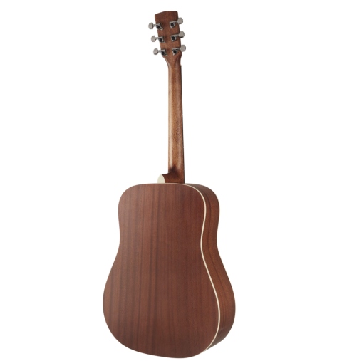 Mahoniowy tył i boki dodają jasnego, naturalnego brzmienia z mocnym i ciepłym środkiem pasma. To drewno, które od dziesięcioleci jest uznawane za standard w konstrukcji tyłu i boków w premium gitarach akustycznych. Dodatkowo, wykończenie z otwartymi porami nie tylko poprawia rezonans drewna, ale także zmniejsza wagę gitary, wpływając pozytywnie na grywalność.