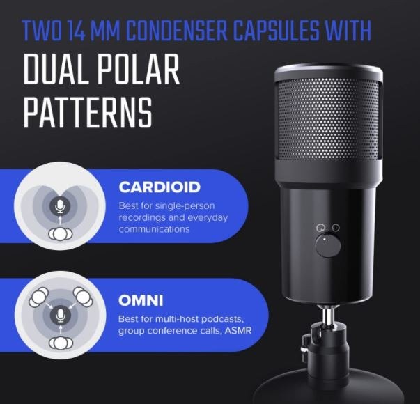 - Ten zewnętrzny mikrofon USB obsługuje dwie charakterystyki kierunkowe, odsłuch mikrofonu w czasie rzeczywistym, przycisk bezpośredniego wyciszenia, rozdzielczość dźwięku do 24 bitów / 96 kHz oraz doskonałą przejrzystość dźwięku.