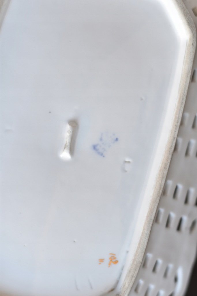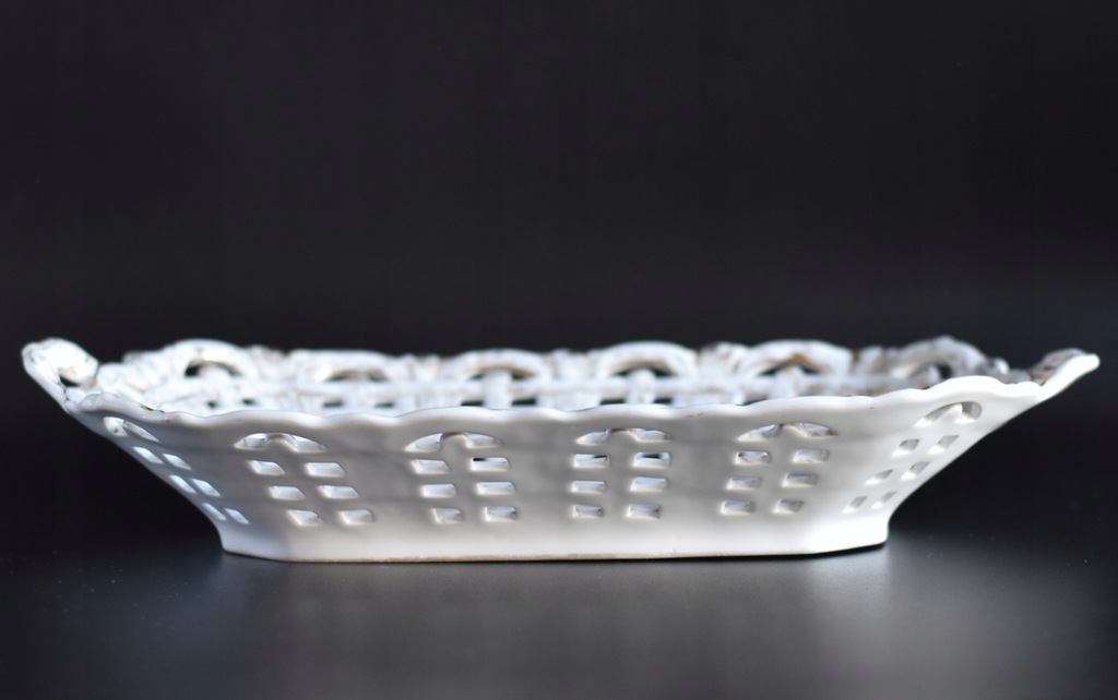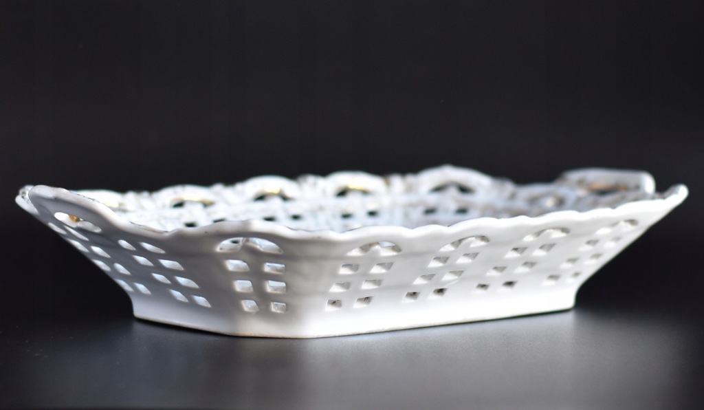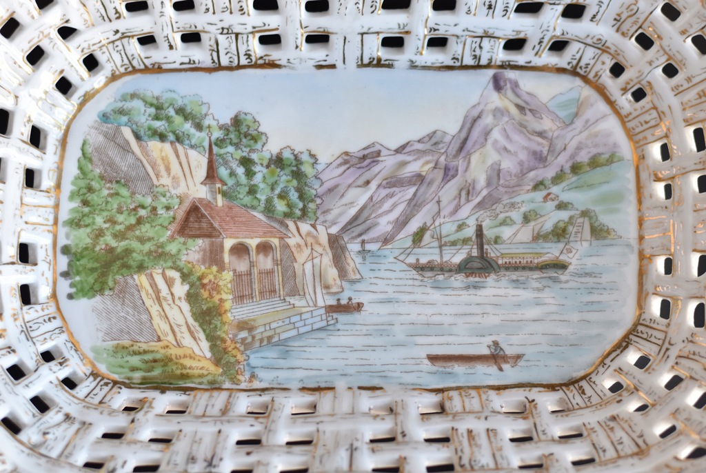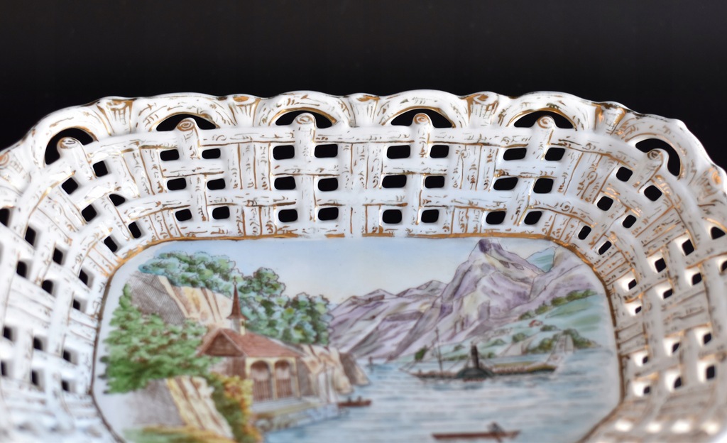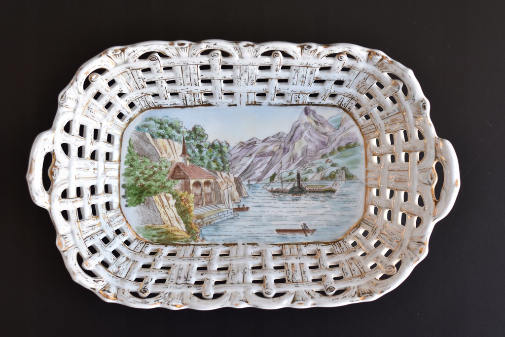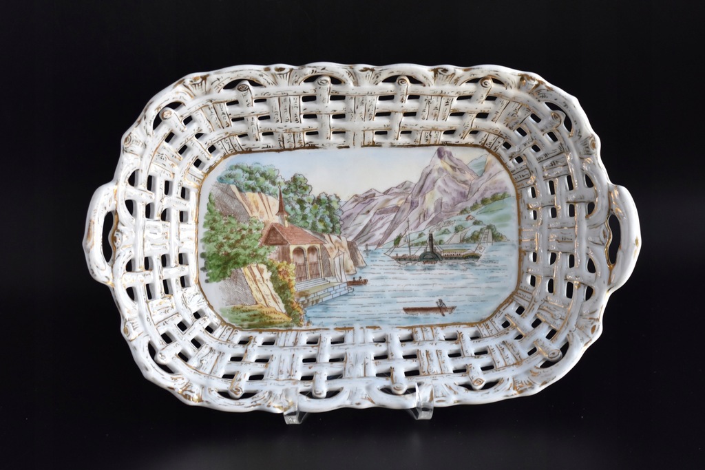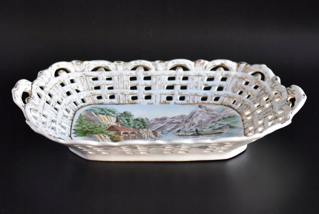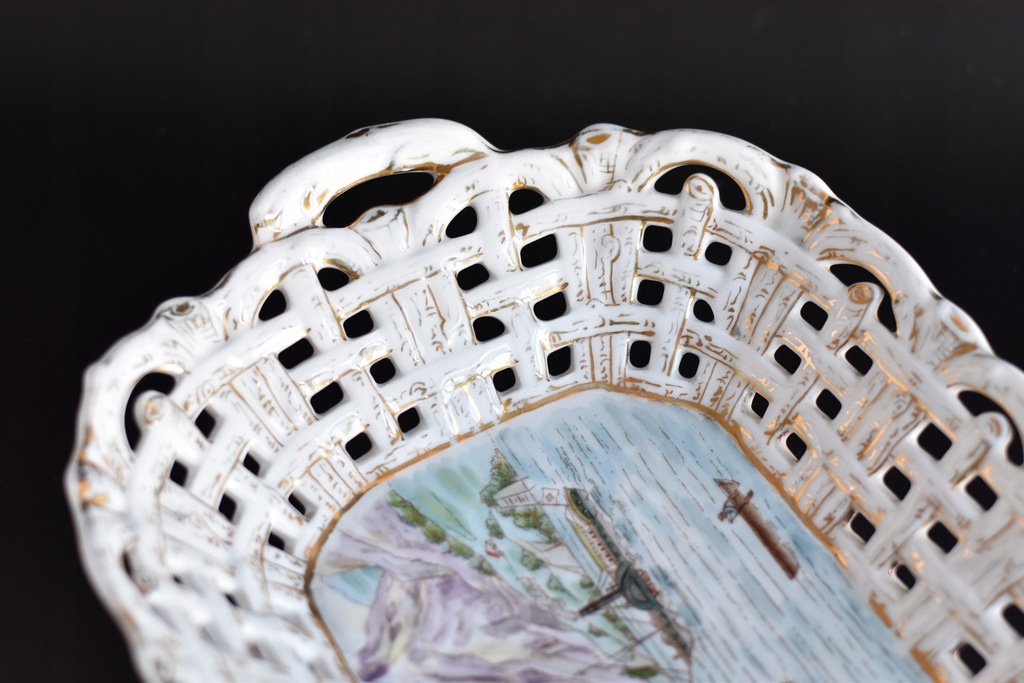 Ażurowa patera lub koszyk z manufaktury Carla Tielscha, która znajdowała się dawniej w Starym Zdroju. Porcelana dekorowana pejzażowym motywem w lustrze patery. Widok otoczony jest ramką z plecionych ażurów podkreślonych złoceniami.