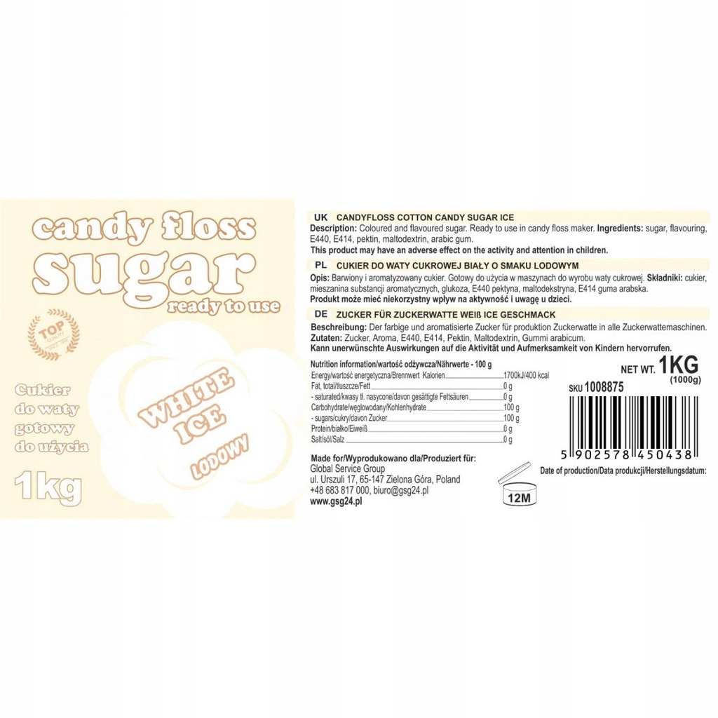 Cukier do waty cukrowej biały o smaku lodowym. Barwiony i aromatyzowany cukier. Gotowy do użycia w maszynach do wyrobu waty z cukru. Najwyższa jakość - 20 LAT DOŚWIADCZENIA w produkcji waty cukrowej oraz kolorowego cukru do waty.