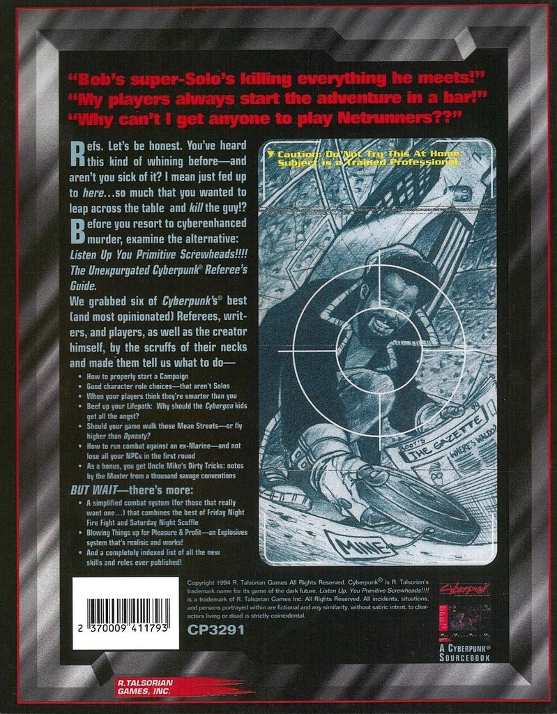 Zanim się poddasz i popadniesz w cyberprzestępczość to zbadaj alternatywę: Listen Up You Primitive Screwheads! to przewodnik dla prowadzących sesje Cyberpunk. Złapaliśmy za kark sześciu najlepszych (i najbardziej opiniotwórczych) prowadzących Cyberpunk, pisarzy i graczy, a także samego twórcę gry, i kazaliśmy im napisać, co mamy robić, bye nie spartolić roboty w prowadzeniu gry!