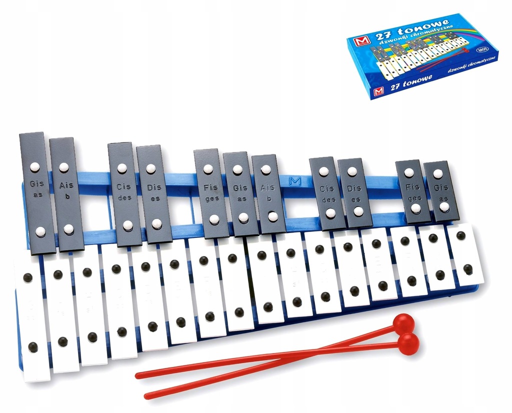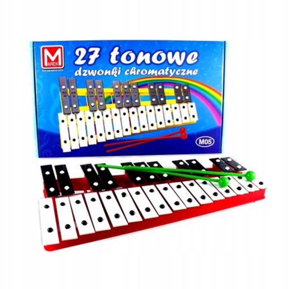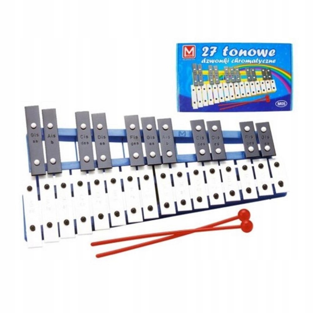 Cymbałki 27 tonowe jest to zabawka, dzięki której dziecko poznaje nuty oraz uczy się grać proste melodie przy wykorzystaniu 2 pałeczek, z pomocą rodzica lub nauczyciela.