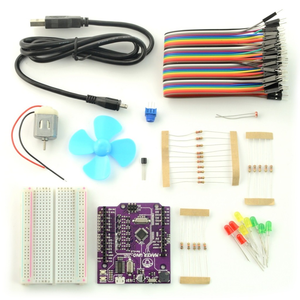 Zestaw elementów elektronicznych ułatwiających rozpoczęcie pracy z modułem Maker UNO. W komplecie m.in.: diody LED, rezystory, silnik, potencjometr, płytkę stykową, wiatraczek i przewody. Zestaw zawiera moduł Maker UNO.