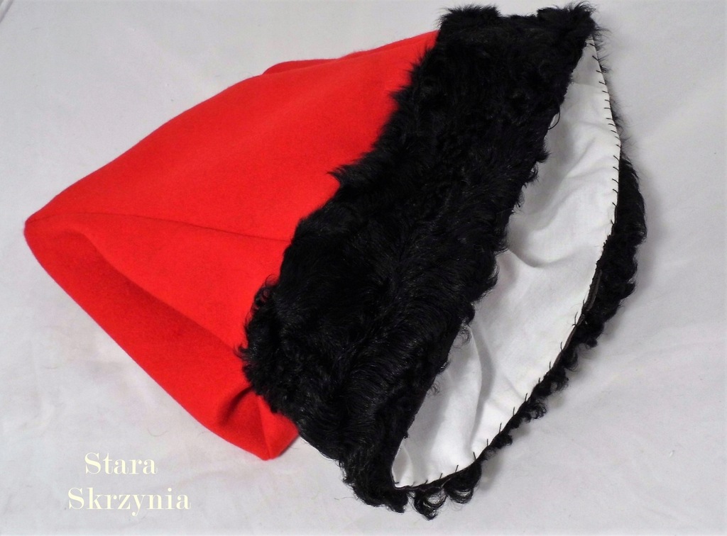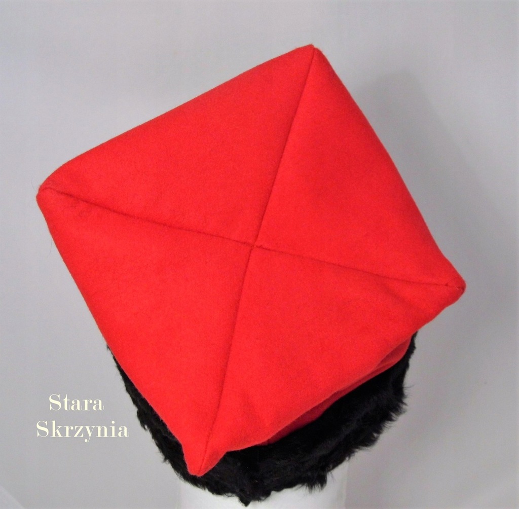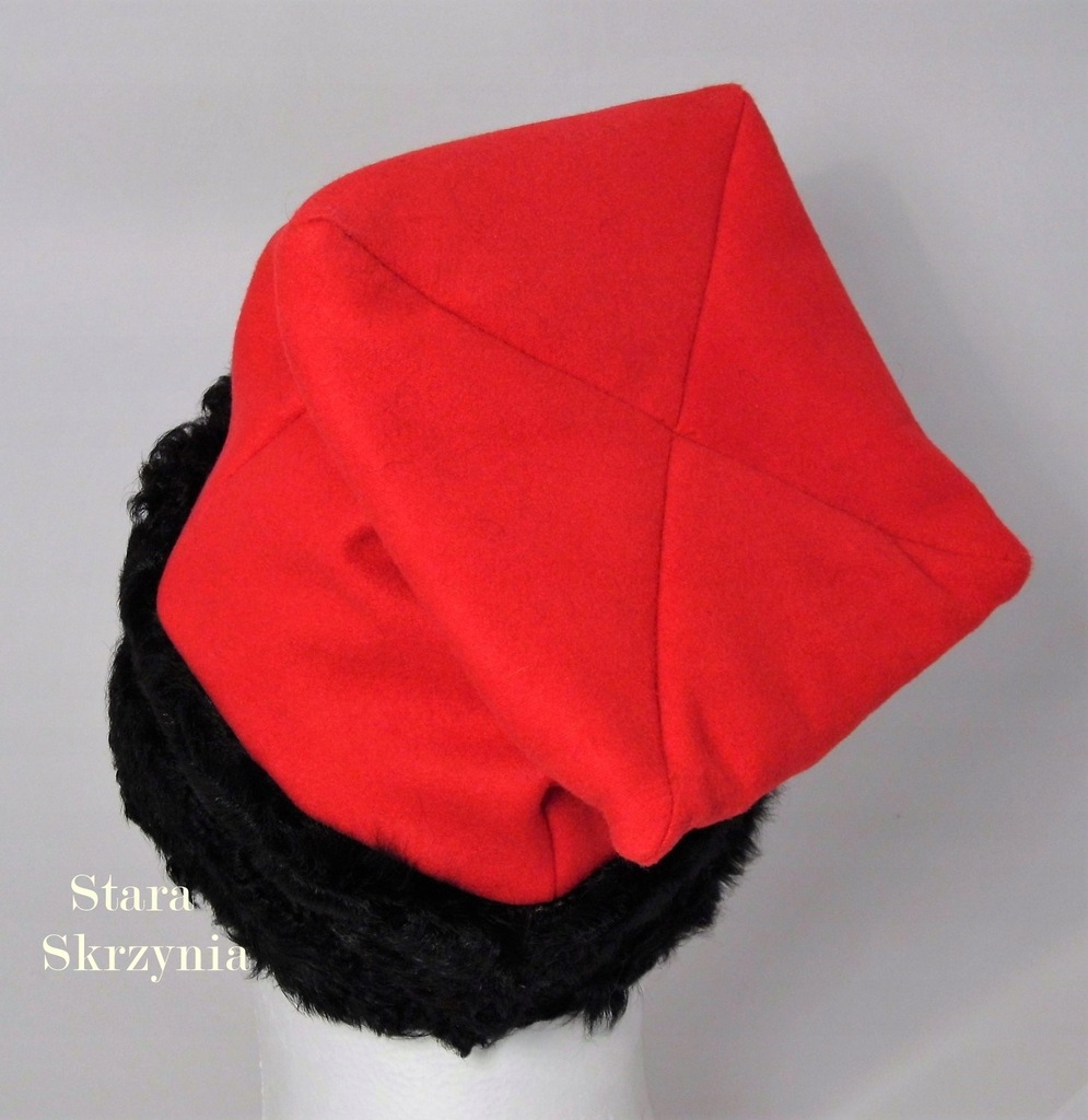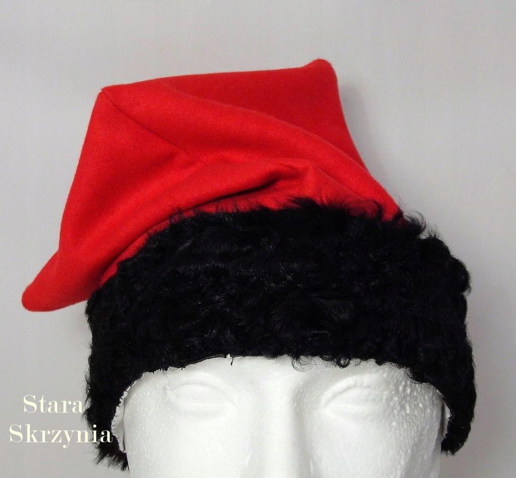 Konfederatka, rogatywka jakiej używali powstańcy w Powstaniu Styczniowym. Czapka wykonana z czerwonego sukna i czarnego futra. Ręcznie podszywana. Rozmiar 55 cm. Możemy też wykonać podobne czapki w innych kolorach i rozmiarach.
