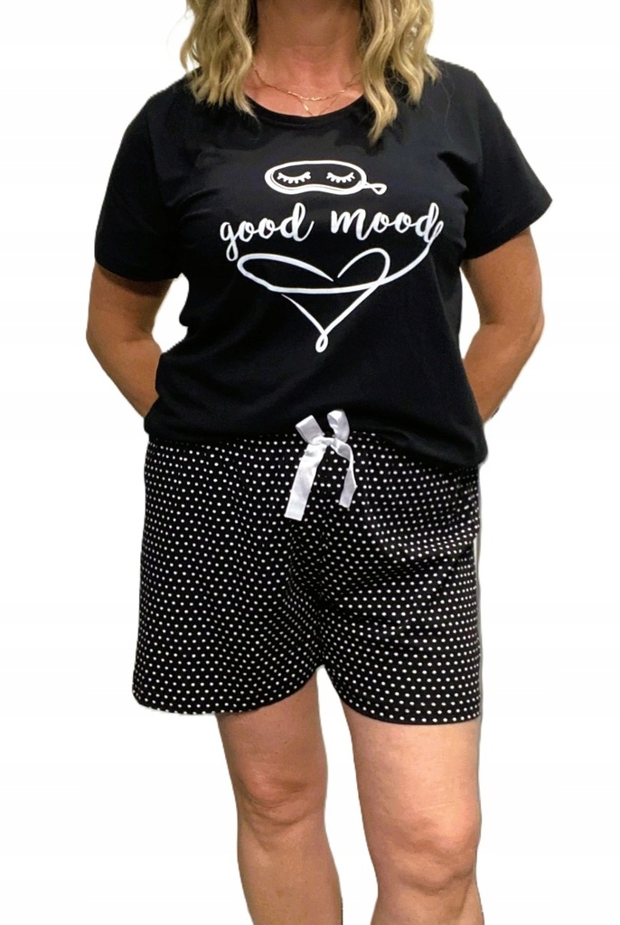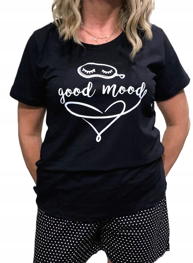 koszulka z napisem na środku i krótkie spodenki w groszki