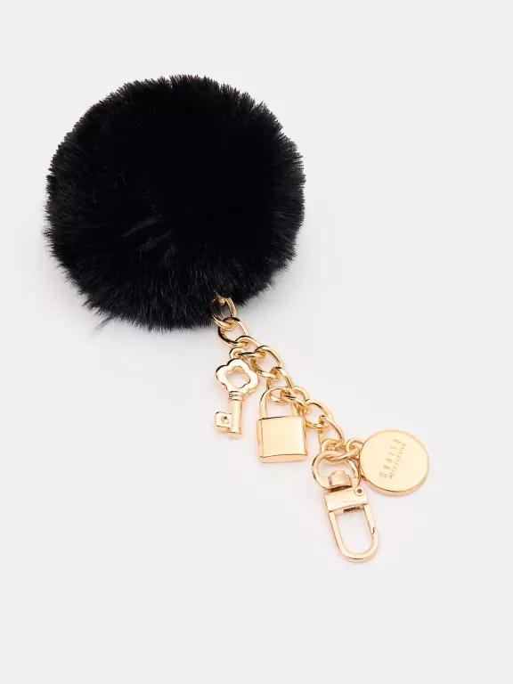 - Czarna torebka z paskiem na ramię i dwoma uchwytami. Posiada ozdobny pompon i zapięcie na zamek.