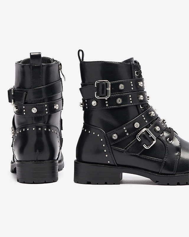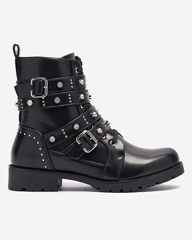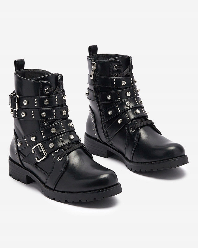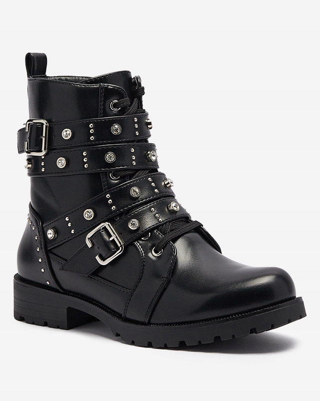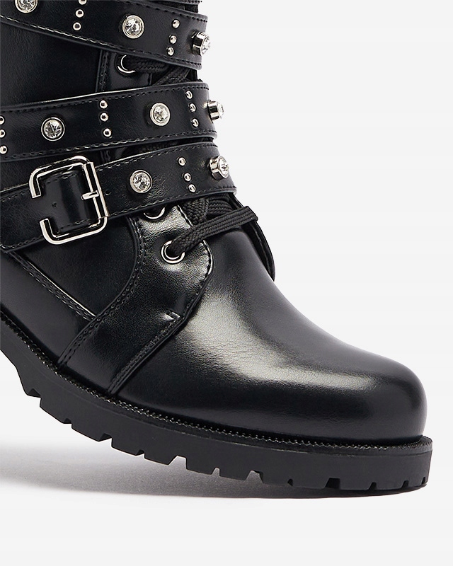 Wyjątkowe botki damskie na płaskim obcasie wykonane ze skóry ekologicznej. Obuwie ocieplane delikatnym futerkiem. Model sznurowany i zapinany na zamek. Cholewka zdobiona paseczkami z cyrkoniami.