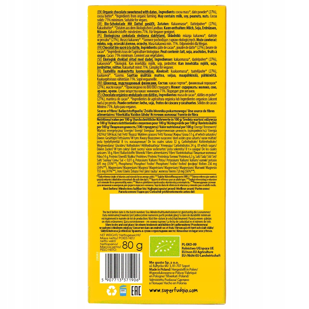 Czekolada słodzona daktylami to wegańska alternatywa dla gorzkiej czekolady słodzonej białym cukrem. To czysty skład - składniki posiadają certyfikaty ekologiczne.