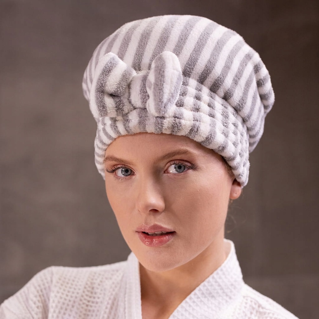 Najwyższa pora porzucić zwykły, wiecznie opadający ręcznik, który może niszczyć strukturę włosa! Nasz miękki i wygodny czepek do włosów to idealna propozycja dla każdej włosomaniaczki. Nie tylko szybko i prosto się zakłada, ale również pozostaje przez cały czas na swoim miejscu. Dodatkowo potęguje efekty i zabezpiecza włosy podczas zabiegów pielęgnacji.