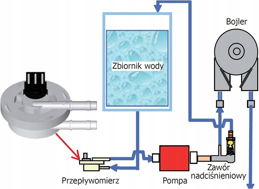 Zadaniem czujnika przepływu wody ( flowmeter ) jest zliczanie pobranej wody ze zbiornika. Dzięki temu urządzenie rozpoznaje, czy i ile wody przepływa przez urządzenie zdjęcie nr 2.