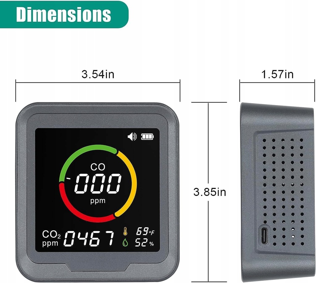 Połączenie czujników NDIR + elektrochemicznych, lepsze do poprawy dokładności wykrywania gazu. Zakres wartości CO: 0~500PPM; Zakres wartości CO2: 400~5000PPM; Zakres temperatur: 32℉~122℉; Zakres wilgotności: 20~80%RH (±5%RH).
