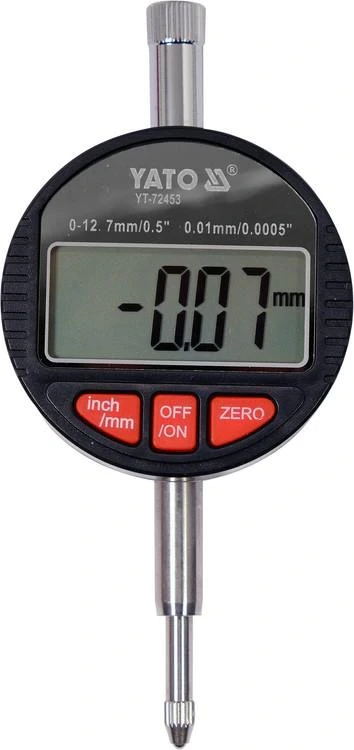 Dane techniczneProducent: Yato Kod : 72453 Zastosowanie: prace warsztatowe|kontrola maszyn|obsługa i kontrola prawidłowości instalacji tarcz hamulcowych oraz wszelkiego rodzaju kół pasowych czy wałów|Zakres temperatury pracy: 0~40 °CTemperatura przechowywania: -20 ~ +70 °CZasilanie: bateryjneRodzaj baterii: 1x LR44Kompatybilne z(e): YT-72460Dokładność pomiarowa: ± 0.01 mmZakres pomiaru: 0-12.7 mmRodzaj odczytu: elektronicznyRodzaj wyświetlacza: LCDJednostka pomiarowa: metry|caleFunkcje: zerowaniaWilgotność względna pracy Rh: 80 %Zastosowanie cd.: stabilny punkt pomiarowy dla sprawdzania bicia elementów obrotowychŚrednica zegara: 57 mmŚrednica trzpienia montażowego: 8 mmCzujnik zegarowy elektroniczny 0-12,7mmProfesjonalny elektroniczny czujnik zegarowy YT-72453 znajduje szerokie zastosowanie w pracach warsztatowych oraz przy kontroli maszyn Doskonale sprawdzi się podczas obsługi i kontroli prawidłowości instalacji tarcz hamulcowych oraz wszelkiego rodzaju kół pasowych czy wałów Dzięki specjalnej podstawie magnetycznej YT-72453 może stanowić stabilny punkt pomiarowy dla sprawdzania bicia elementów obrotowych.Podziałka 0,01 mmZakres pomiaru 0-12,7 mmTrzpień montażowy - ? 8 mmŚrednica tarczy zegara ~ ? 57 mmZapakowany w solidne pudełko z tworzywa.**Zdjęcia poglądowe