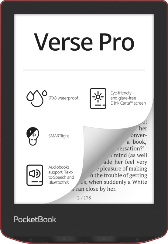 PocketBook Verse Pro to bardziej zaawansowana wersja modelu Verse. Model został dodatkowo wyposażony w większą pamięć wewnętrzną, ekran o najwyższej możliwej rozdzielczości druku cyfrowego, obsługę audio i łączność Bluetooth. Verse Pro zapewnia wszystkie najważniejsze funkcje do komfortowej lektury ebooków, a także te bardziej ekskluzywne, jak wodoodporność i automatyczną rotację ekranu.