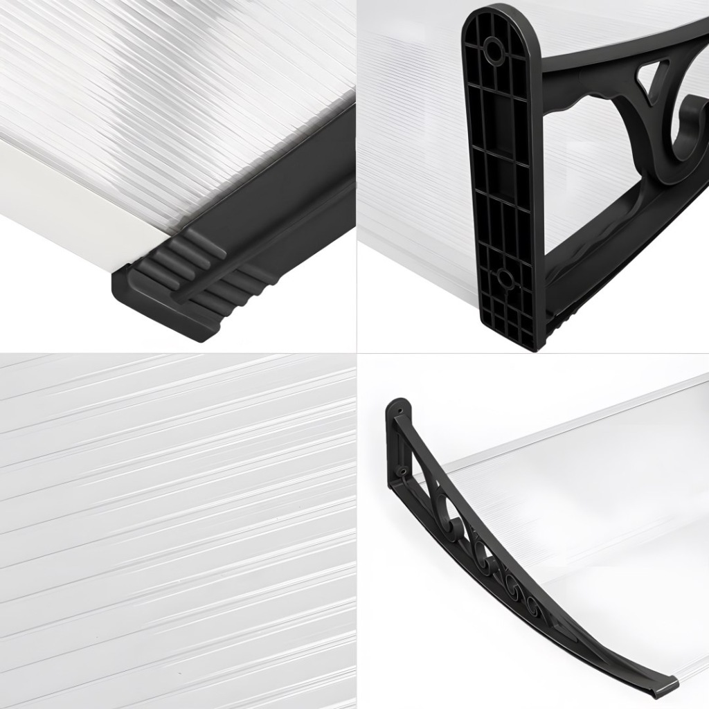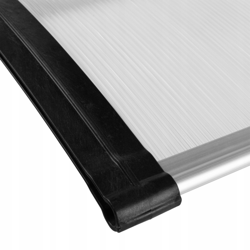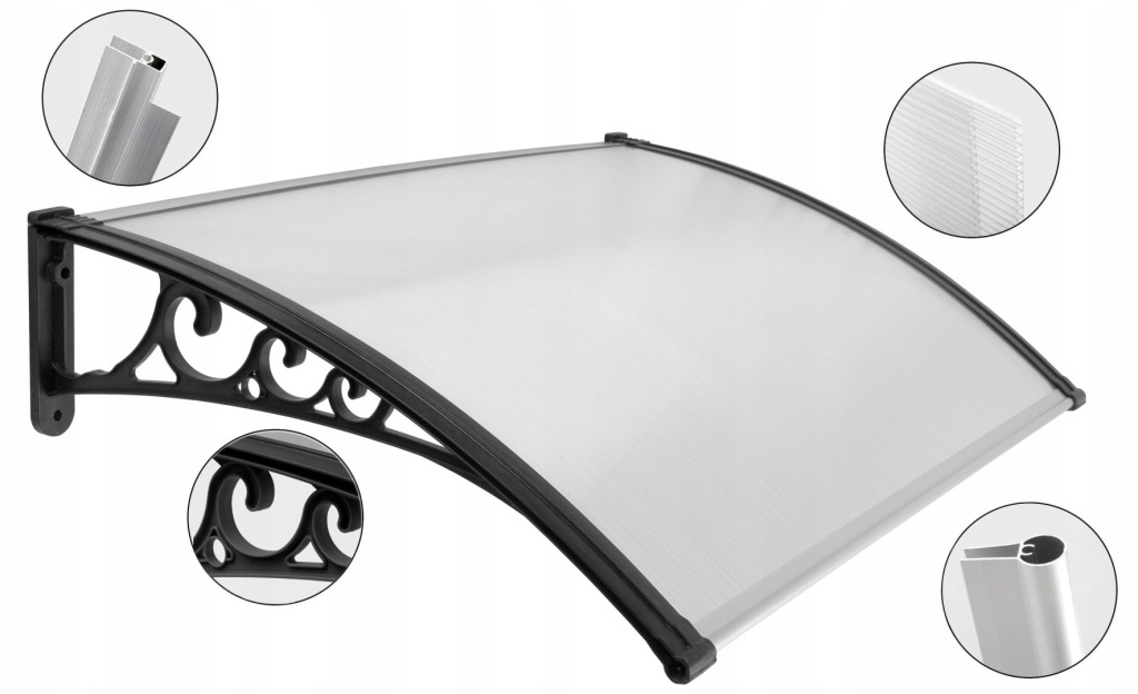 Wykonany z trwałego poliwęglanu komorowego o grubości 5,2 mm, odpornego na uderzenia i mocnych wsporników z tworzywa sztucznego. Transparentna płyta chroni przed deszczem i śniegiem, a czarne uchwyty zapewniają stabilność i estetykę.