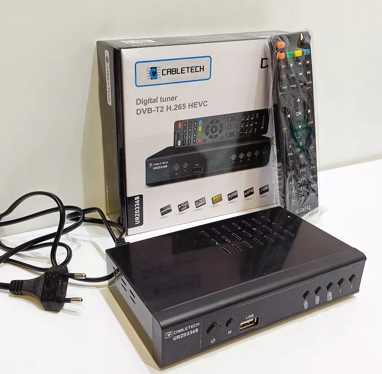 - Tuner DVB-T2 HEVC Cabletech URZ0336B umożliwia odbiór naziemnej telewizji cyfrowej zarówno w standardzie DVB-T jaki i nowszym DVB-T2 z kodekiem HEVC. Dzięki kodekowi HEVC tuner będzie gwarantować prawidłowe działanie także po wprowadzeniu zmian standardu kodowania.