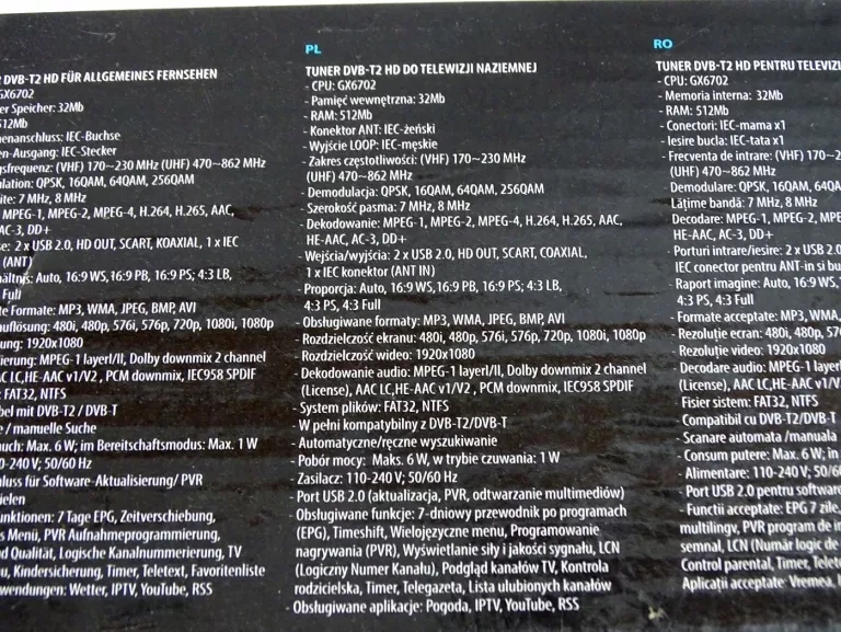 - W pełni kompatybilny z DVB-T2 / DVB-T H.265 HEVC