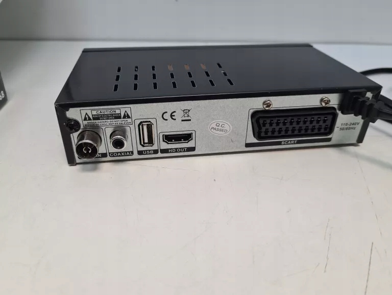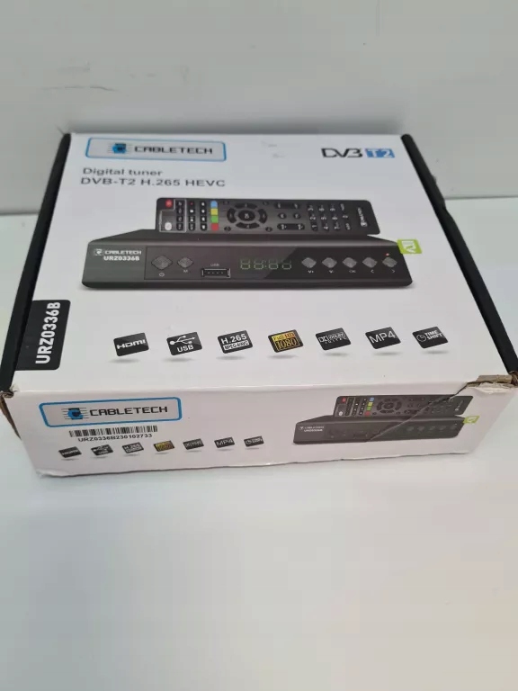 Tuner DVB-T2 H.265 HEVC wraz z opakowaniem i pilotem