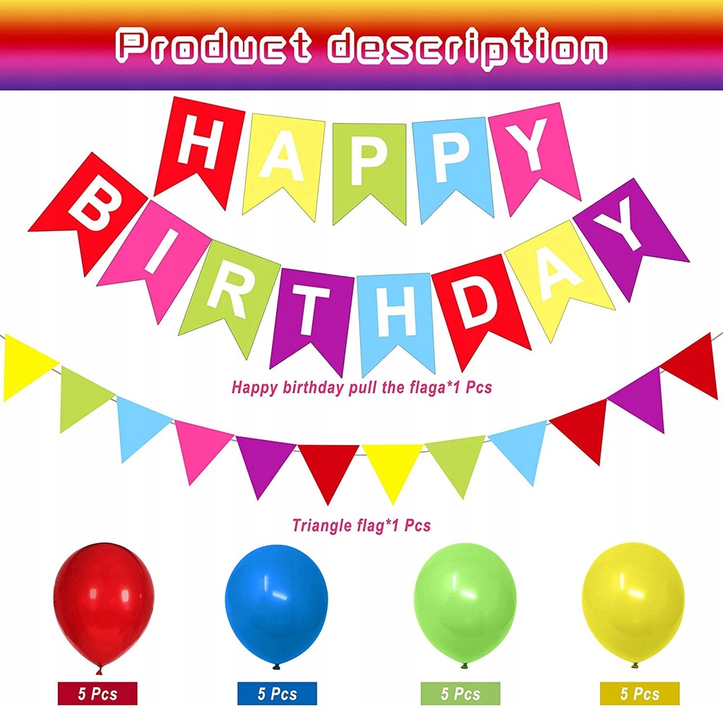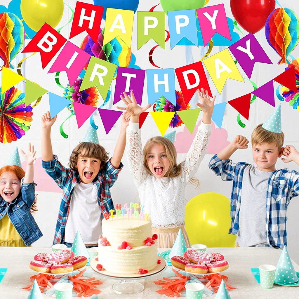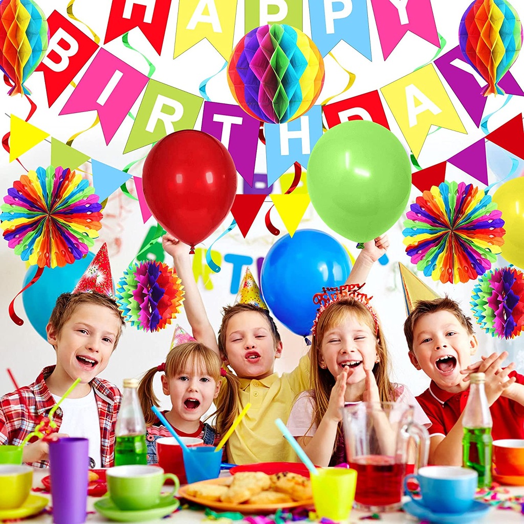 Kolorowy zestaw dekoracji urodzinowych: dekoracje na przyjęcie urodzinowe mają wszystko, czego potrzebujesz, aby udekorować przyjęcie urodzinowe. Ten zestaw zawiera: balony (5 * zielony + 5 * niebieski + 5 * żółty + 5 * czerwony), 1 x baner HAPPY BIRTHDAY, 1 x trznadel trójkątny, 1 x girlanda z okrągłych kropek, 1 x kulki o strukturze plastra miodu, 2 x balony o strukturze plastra miodu, 2 x kolorowy papierowy kwiat wentylatora, 2 x kulka o strukturze plastra miodu, 8 x wiszący wir.