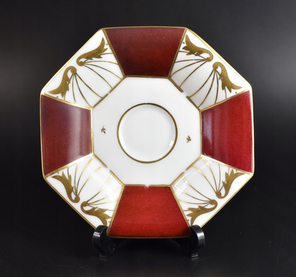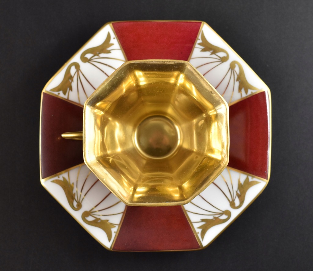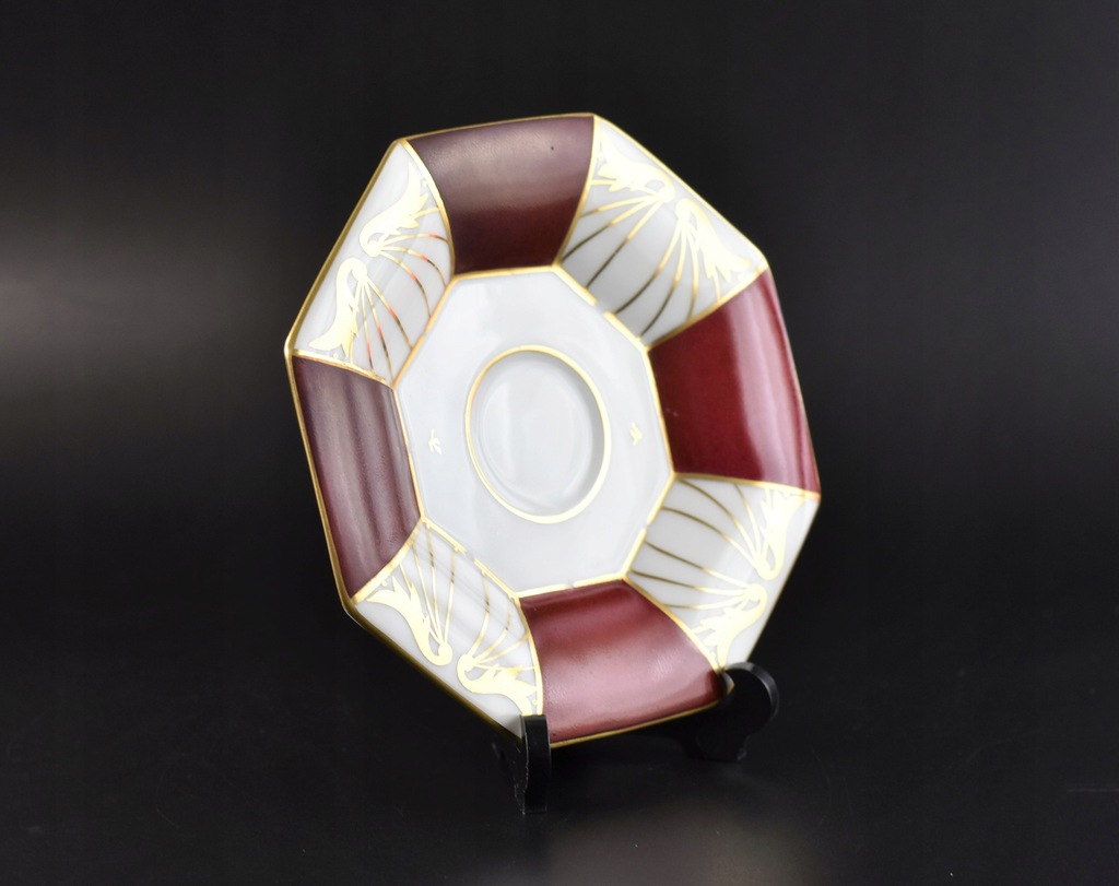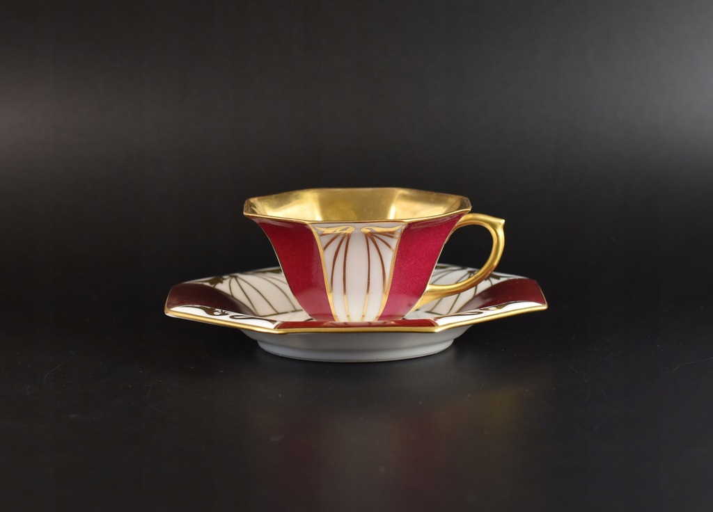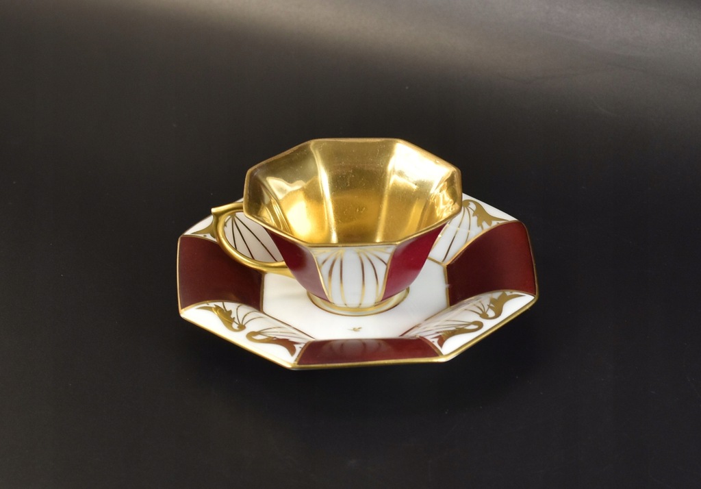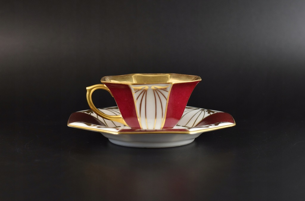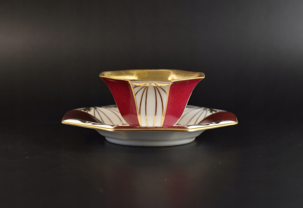 Mała, dekoracyjna filiżanka porcelanowa ze złotym środkiem. Biała porcelana zdobiona bordowymi akcentami oraz złotymi ornamentami. Całość jest ręcznie malowana.