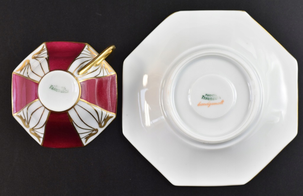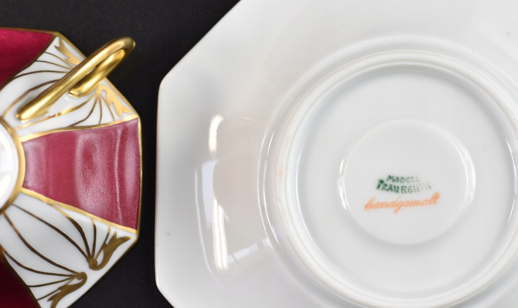 Filiżanka pochodzi z manufaktury Ernst Bohne Söhne, która mieściła się w niemieckiej miejcowości Rudolstadt. Jest to model wzorowany na wyrobach znanej, saksońskiej manufaktury Fraureuth. Porcelana powstała w latach 1901 - 1937. Filiżanka pochodzi z większego zestawu, którego niektóre elementy oznaczone były sygnaturą N z koroną, datowaną na te lata. Prezentowane tutaj duo sygnowane jest nazwą modelu oraz napisem „handgemalt“, co oznacza „ręcznie malowane“.