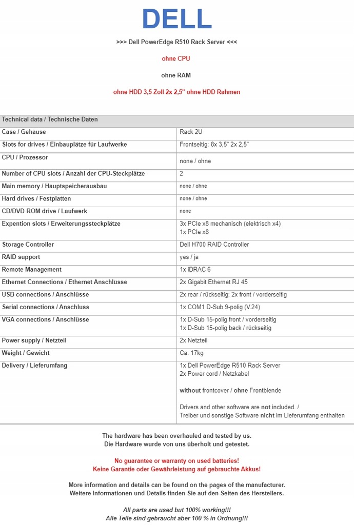 Na tej aukcji oferujemy - Dell PowerEdge R510 Server no CPU no HDD no RAM H700 3,5 8 Bay 2x 2,5