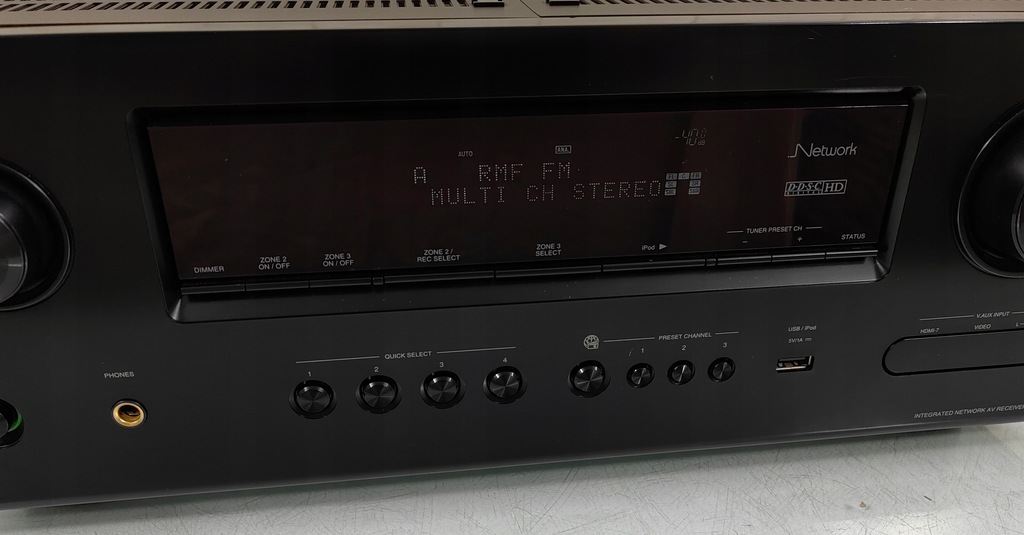 Dwa podstawowe pokrętła (wzmocnienia i wyboru źródeł) nie są zbyt duże, za to jasnoniebieski display pokazuje mnóstwo informacji i przy tym bogactwie może się wydać wręcz nieczytelny, jednak w nowoczesnym amplitunerze nikt nie będzie do tego przywiązywał wielkiej wagi, mając przecież do dyspozycji nie tylko menu ekranowe, ale i kilka innych dodatkowych możliwości, o których za chwilę.