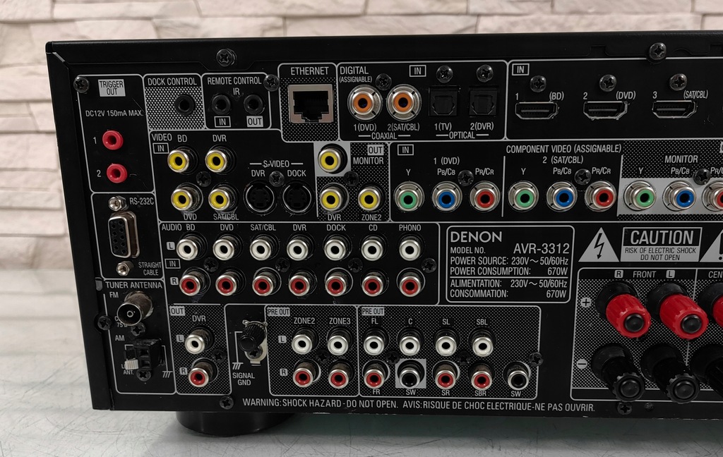 Złącza HDMI występują w liczbie 7 wejść (wraz z podręcznym) oraz dwóch wyjść - wszystkie w wersji v1.4, a więc z obsługą 3D i związanymi z nim dodatkami (protokół ARC działa na obydwu wyjściach). Denon AVR-3312 umożliwia dowolne skalowane sygnału w górę. Pozostałym standardom wideo nie towarzyszą może rekordowe liczby gniazd, jednak szeroki wachlarz formatów powinien to wynagrodzić - bowiem oprócz komponentu (dwa wejścia i jedno wyjście) znajdziemy wciąż obowiązkowy kompozyt (4 wejścia/2 wyjścia), a nawet S-Video (2 wejścia).