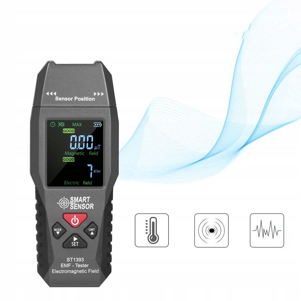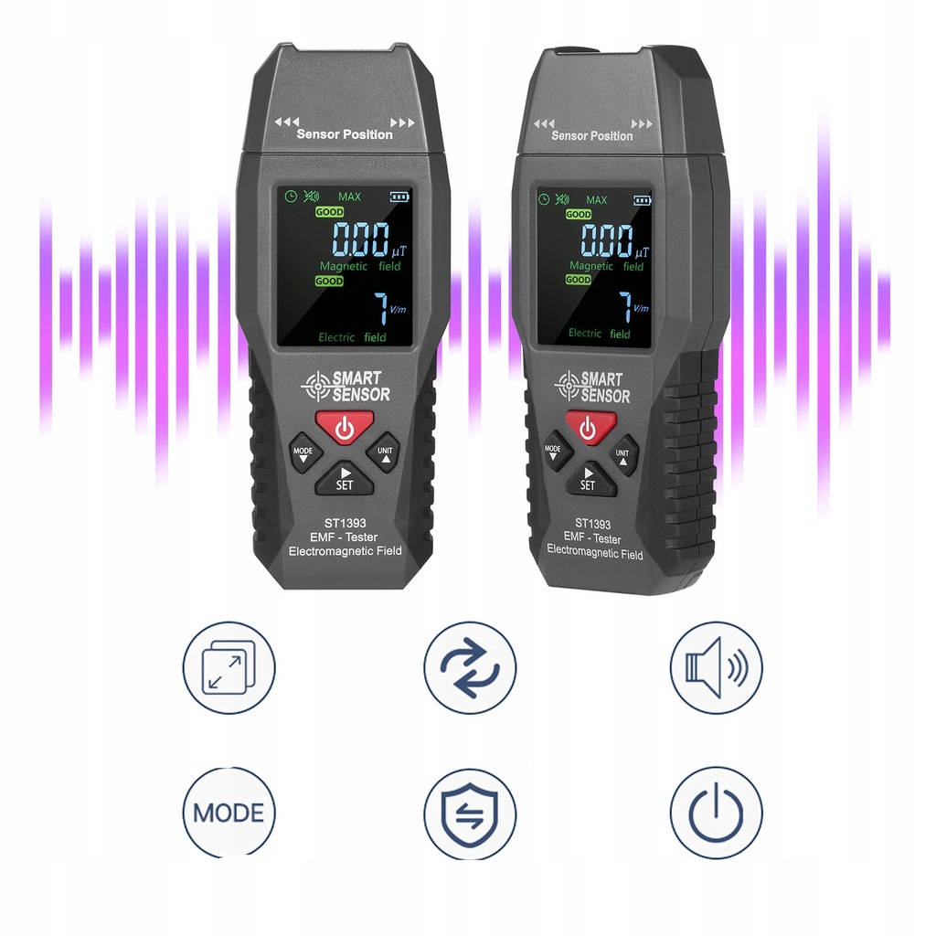 Szeroki zakres częstotliwości wykrywania i pomiaru: pole magnetyczne 20 Hz ~ 300 Hz i pole elektryczne 20 Hz ~ 3500 MHz zakresu częstotliwości roboczej; 0,01~199,9μT (0,1~1999mG) pole magnetyczne i 0~1999V/m pole elektryczne zakresu pomiarowego.