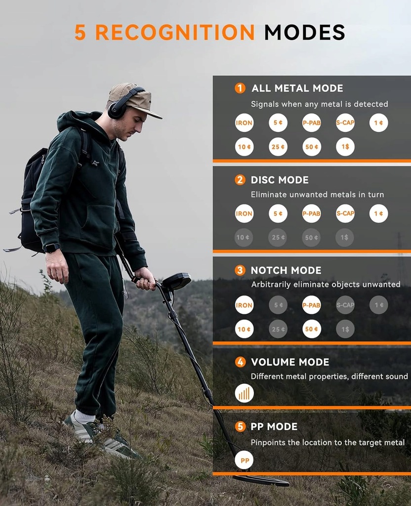 - [9 Rodzajów Próbek Metali i 5 Trybów] Wykrywacze metali dla dorosłych SUNPOW są wyposażone w 9 rodzajów próbek metali i 5 różnych trybów wykrywania metali, co pozwala skutecznie wyszukiwać żądane metale. Wszystkie TRYB METALOWY, TRYB DYSKOWY, TRYB WYCIĘCIA, TRYB GŁOŚNOŚCI, PINPOINT.
