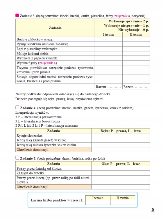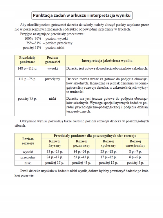 Aby określić poziom gotowości dziecka do szkoły, należy zliczyć punkty uzyskane przez nie w poszczególnych zadaniach i odszukać odpowiednie przedziały w tabelach.