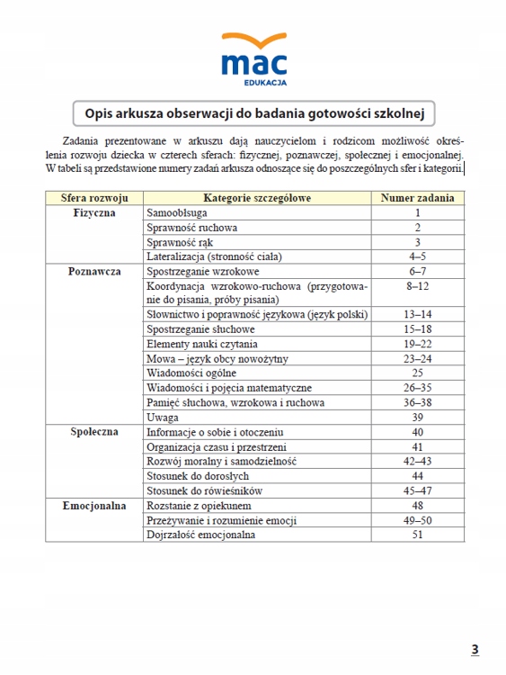 Zadania prezentowane w arkuszu dają nauczycielom i rodzicom możliwość określenia rozwoju dziecka w czterech sferach: fizycznej, poznawczej, społecznej i emocjonalnej.